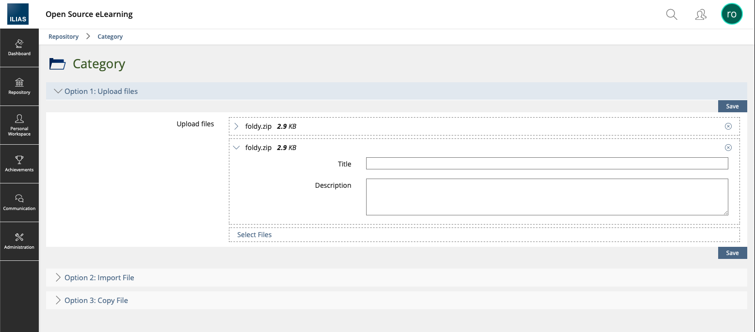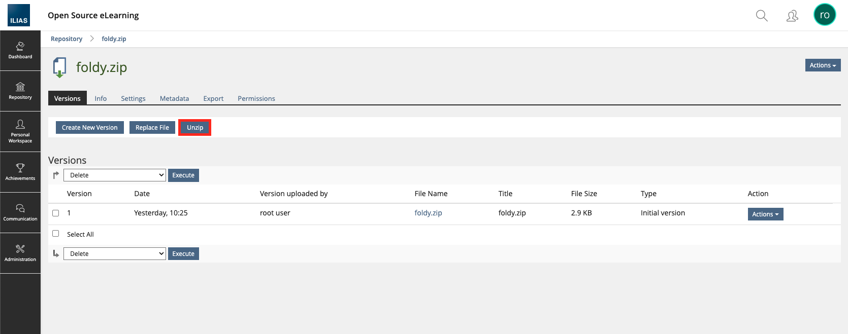 Changed Behaviour: The initially uploaded ZIP stays as an own File-Object in the Repository. This allows to later unzip it to other locations as well.