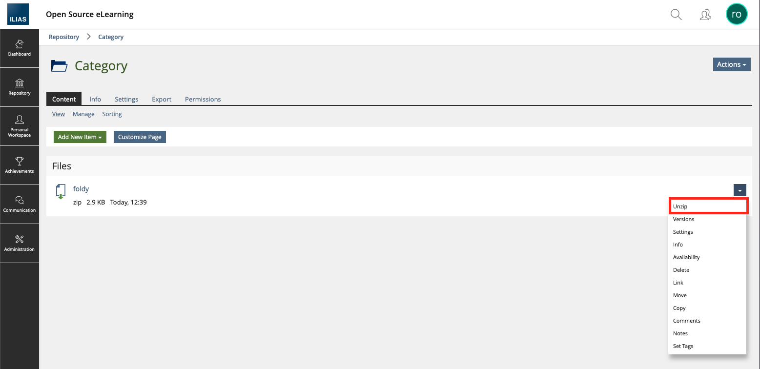 We also refactored the creation-form of new file objects which now use a Kitchensink form instead of a ilPropertyForm. With doing this a dilema ocurred: The property-form contained sort of conditional form-inputs, that appeared when uploading a zip-archive. Kitchensink form-inputs are not yet able to handle conditional inputs or sub-inputs, therefore we had to remove the "Unzip" and "Keep Structure" options from the form. Instead, we now display a new "Unzip" action in the object-list, that only appears if the current file-revision is a zip-archive. The unzip action also appears when managing file-versions, where the button appears in the toolbar of the page (as well, only if the current file-revision is a zip-archive).