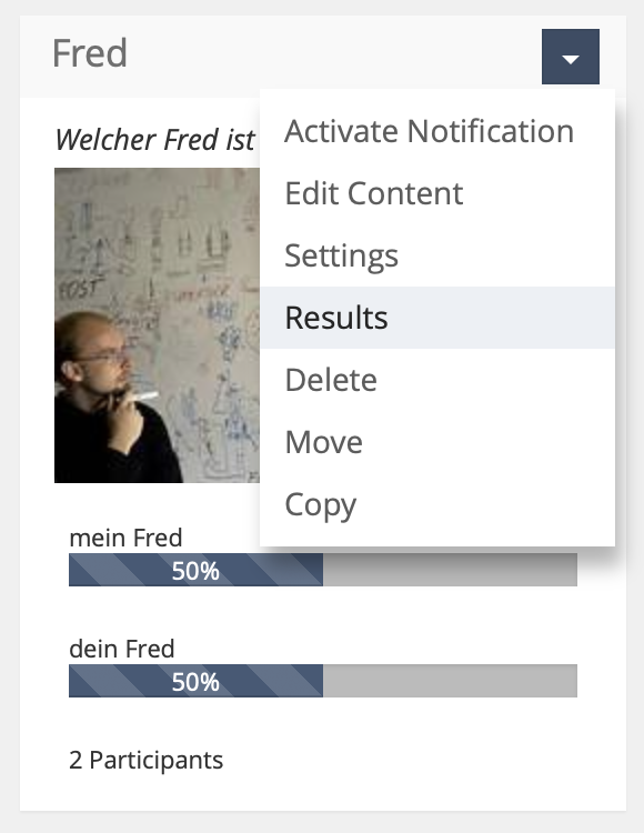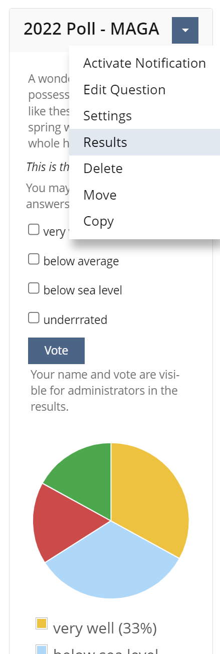 - Results are shown in the form of a chart according to the settings: either always, never, directly after the user has voted, or after the voting period has ended. In the latter case, the results are always shown if no voting period is set. The results are never shown when nobody has cast a vote, regardless of the setting.