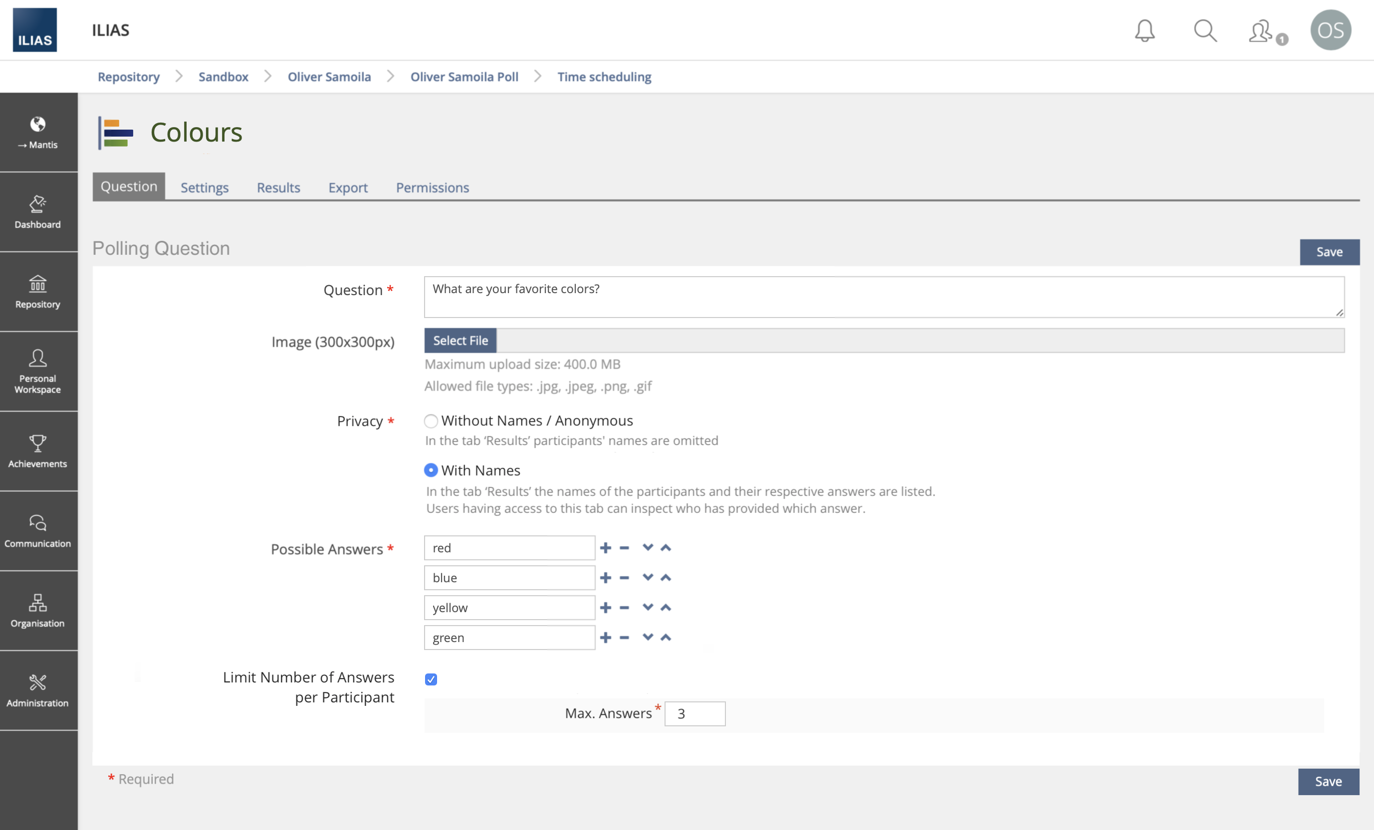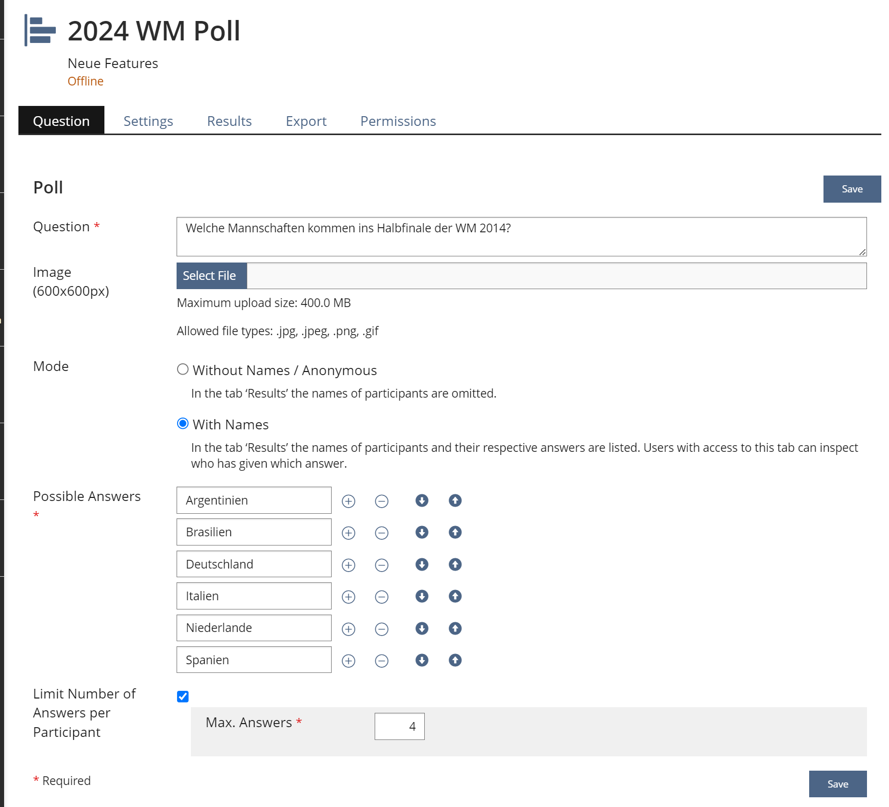 - A value to "Maximum Number Of Answers per Participant" must always be entered, even if no limitation is intended. It is confusing in the creation process to first define the maximum number of answers per participant and then enter the possible answers.
