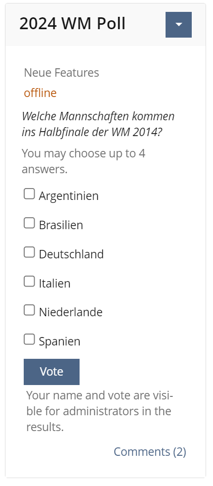 - Title and description of the poll, an anchor with its id, whether it is offline (or unavailable), and comments (if enabled) are always rendered in the block.
