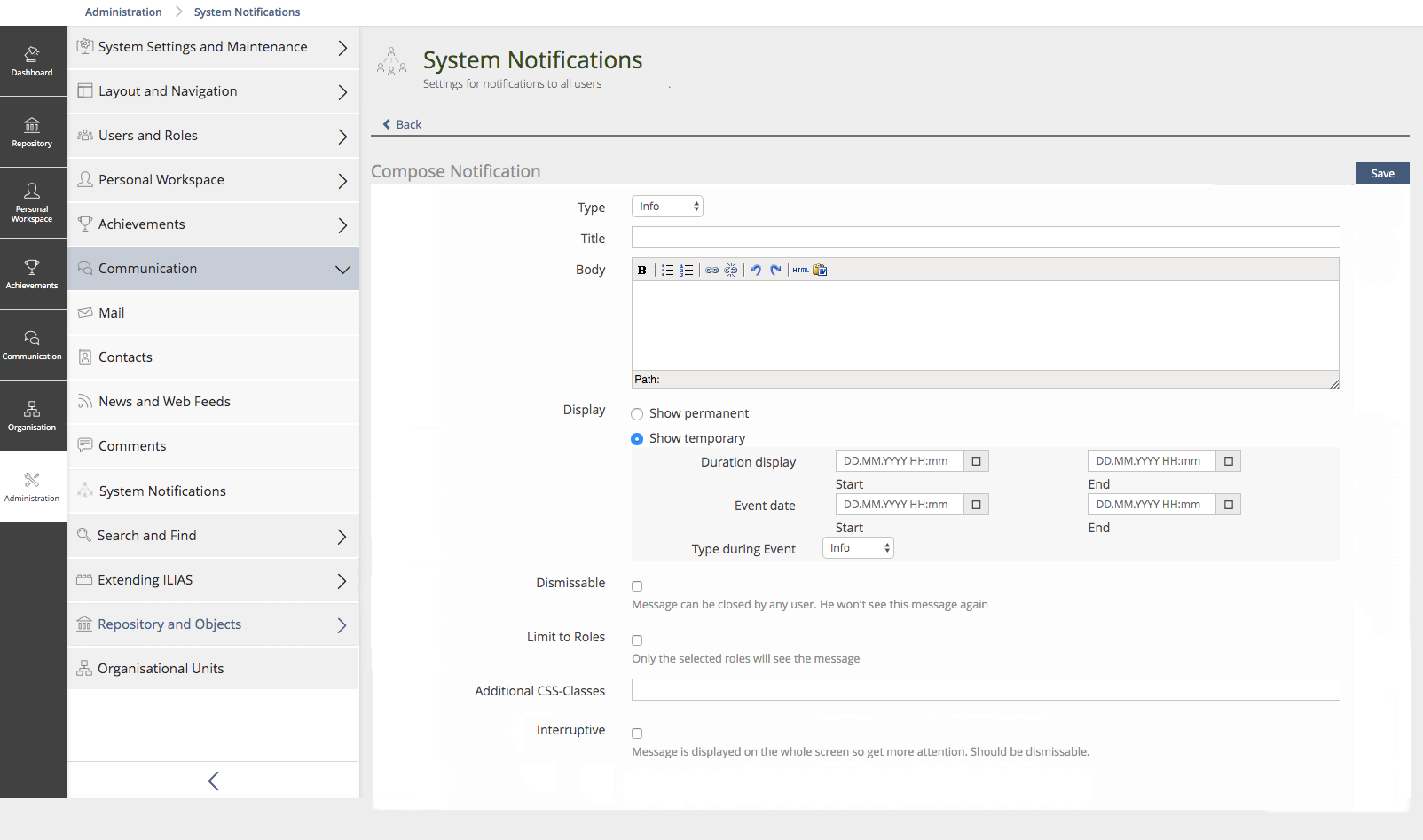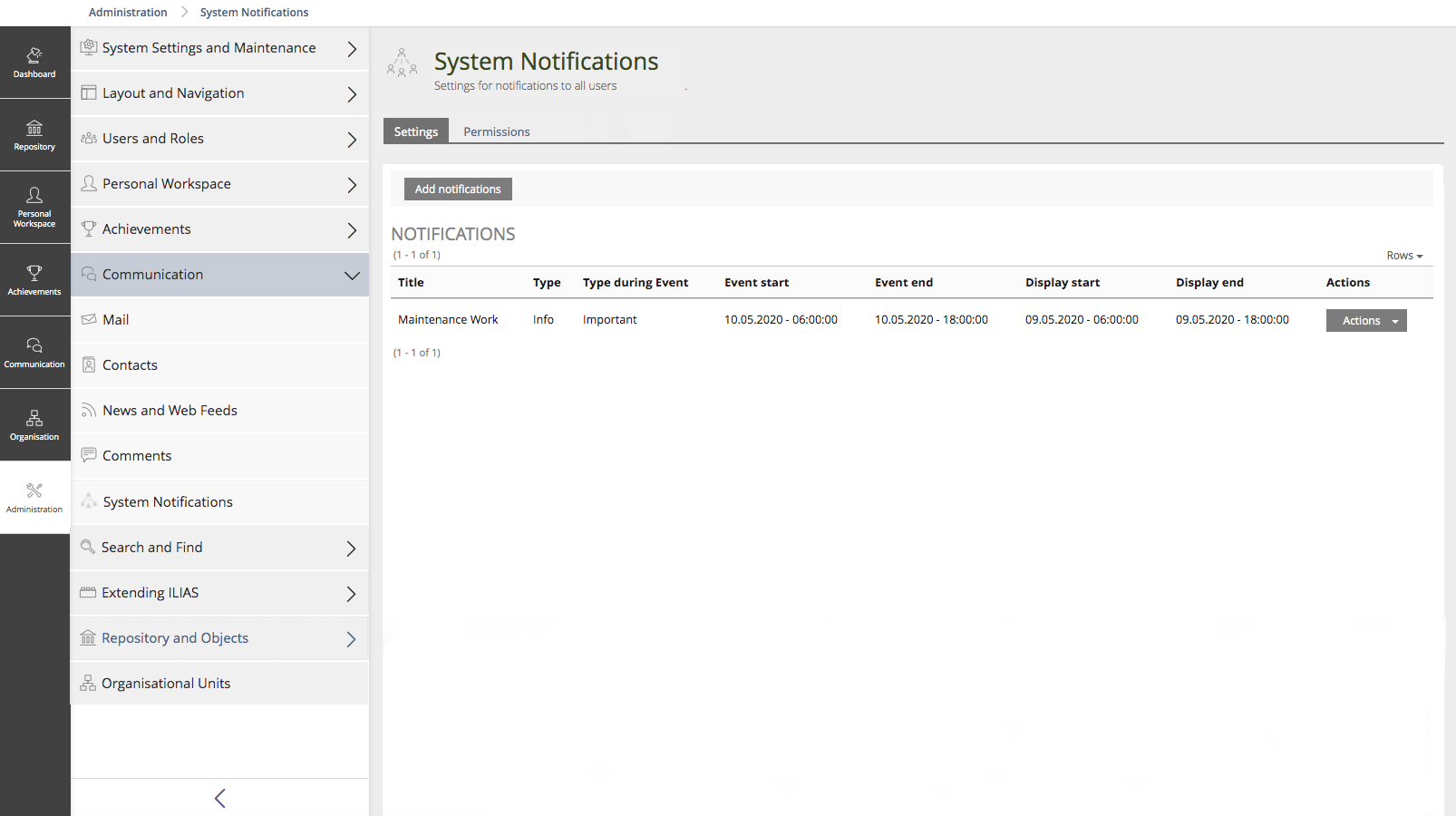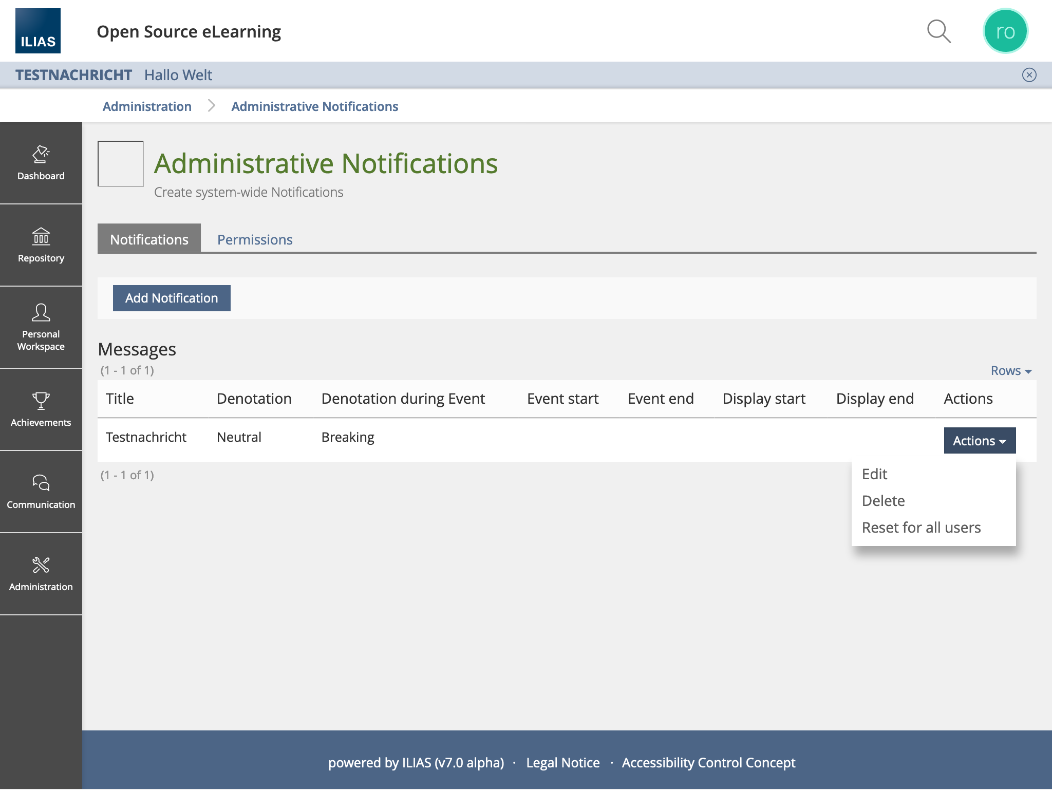 In ILIAS it is not yet possible to send system-wide notifications to users. But often there is important information that needs to be distributed to the users by ILIAS administrators (e.g. regarding maintenance work) or by the components themselves (e.g. with regard to features that are no longer supported or ather thing which needs attention of a group of users).