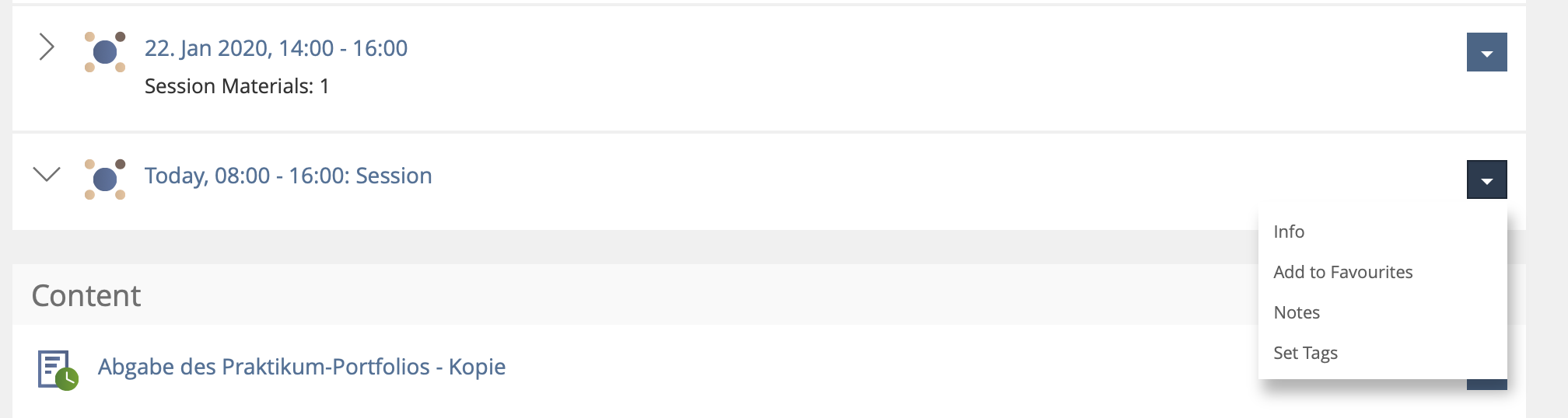- Action menu: No action for "Attend" session available.
