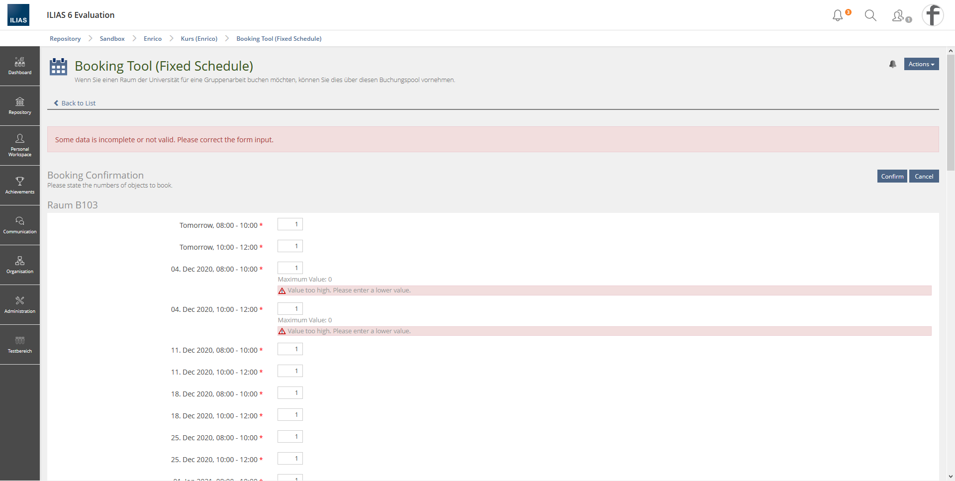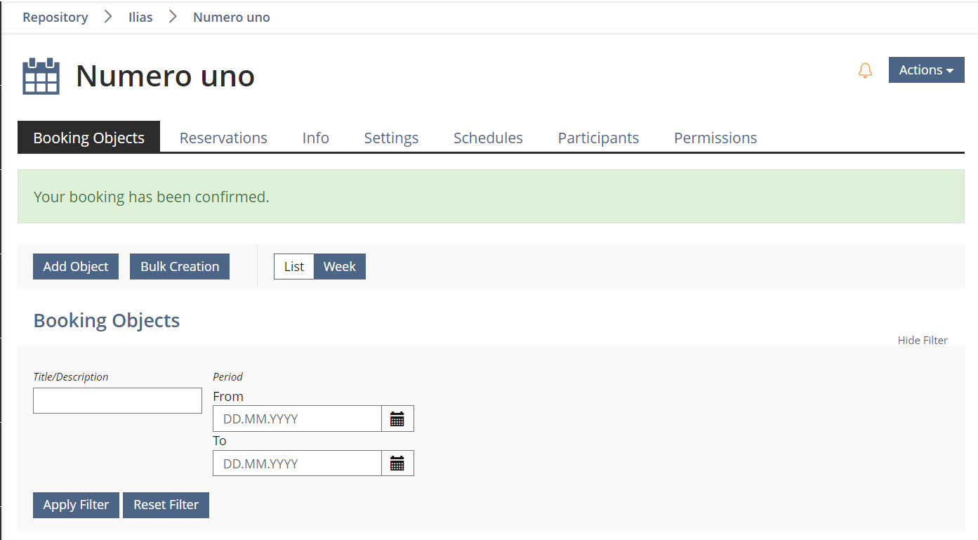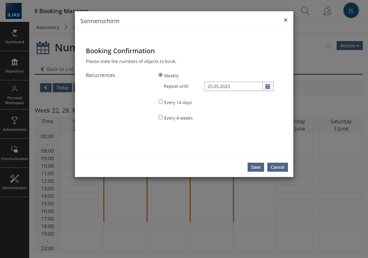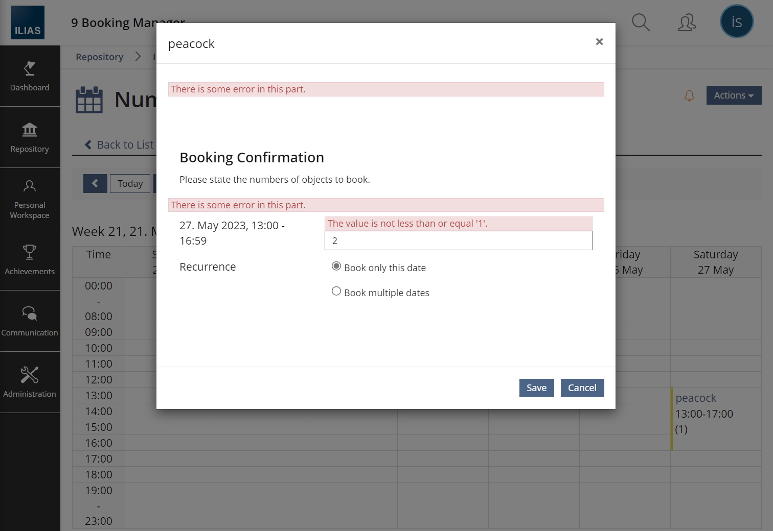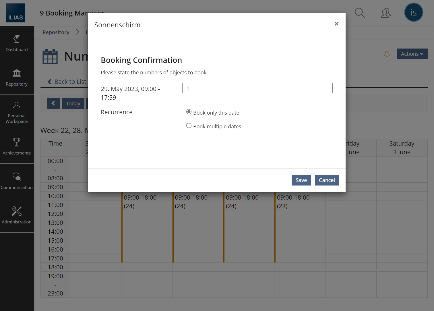 - Users can now specify the number (if set) of objects to be booked. You can also specify whether you want to book only this date or repetitions.