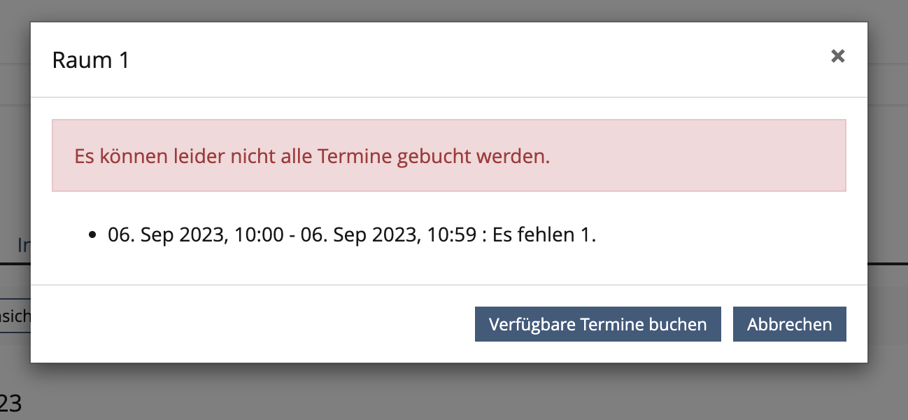 - If not all data is available, users are notified which date is not available. Using the "Book available data"-button, the booking object can be reserved on the available dates. Using the Cancel button, the booking process can be cancelled.