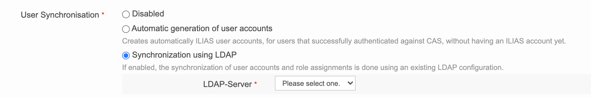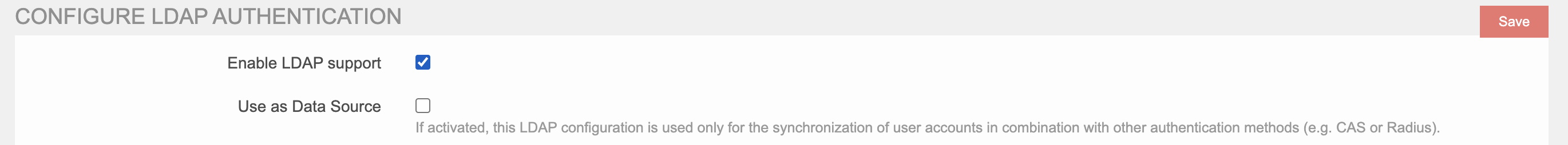 In the LDAP settings it can be set that the LDAP should only be used as a data source. The individual authentication options (CAS, Radius,...) can then use these accounts. This does not work with Shibboleth.