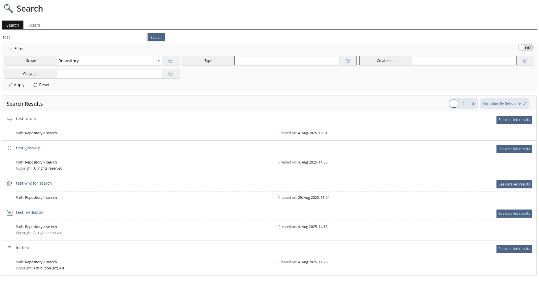 - Objects with subobjects also have a main action 'See detailed results', which shows search results in its subobjects.
