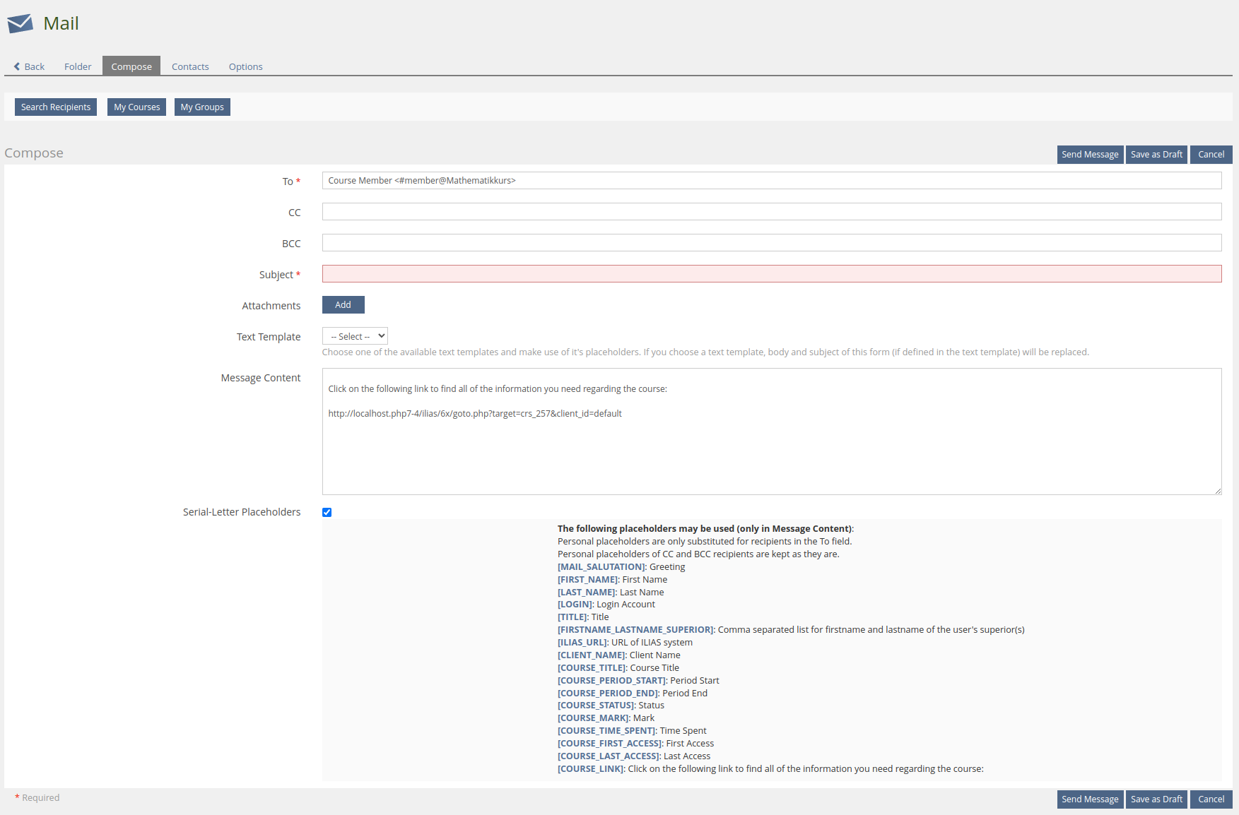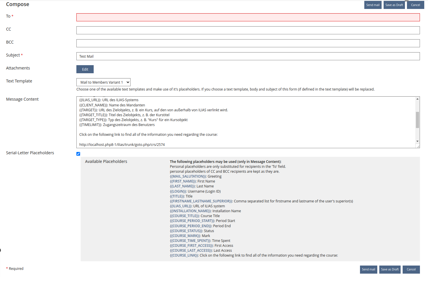 JourFixe, ILIAS [jourfixe], 10 JUL 2023 : We prefer to substitute the placeholders by the related title of the placeholders ( {MAIL_SALUTATION} → Mail Salutation ). Otherwise, ILIAS would send a CC mail to all CC recipients for _every_ recipient in the TO field (when placeholders would be substituted by the real user names).