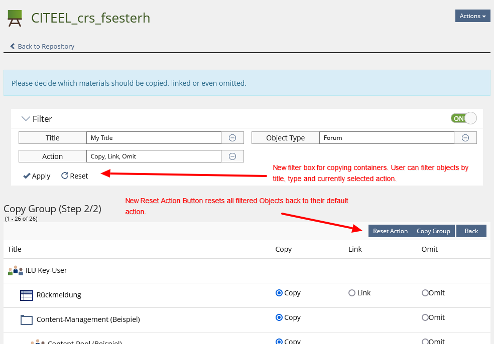 The copy process screen is enhanced with a filter box to enable users to quickly filter objects by type. This allows to then quickly switch the action from copy to link by item type etc. Additionally a "Reset Action" button is added with which users can restore the default action for all item types.