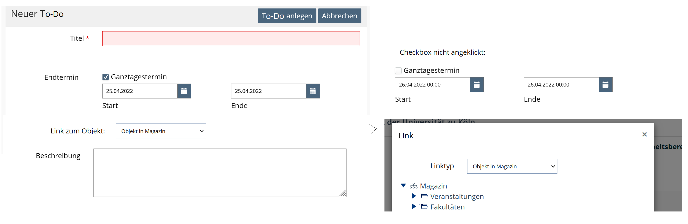 In the GUI „Create New Task“ you can enter a title and an optional description for the user. An end date does not have to be entered (analogous to an unpublished blog post). If you want to enter an appointment, you have the choice between an all-day appointment or an appointment with a selected time (analogous to an appointment in the calendar). Similar to the links to the exercise or to the blog, the self-entered tasks should also be able to link to an ILIAS object. This is very useful for example, if a test has to be completed by day/time. The process of linking works like all internal linking. Its also possible to ad an description.