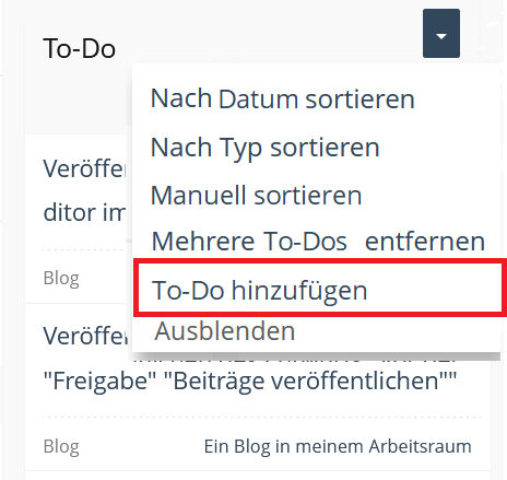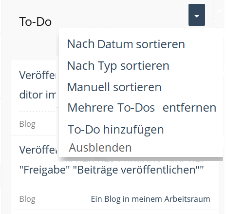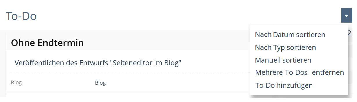 In the Dashboard, the new entry "Create Tasks" appears in the actions menu. In the tasks GUI, the actions menu would have to be inserted. Here, in addition to “Add entry”, “Sort by Date”, “Sort by Type” and “Remove Multiple Tasks” functions could appear.