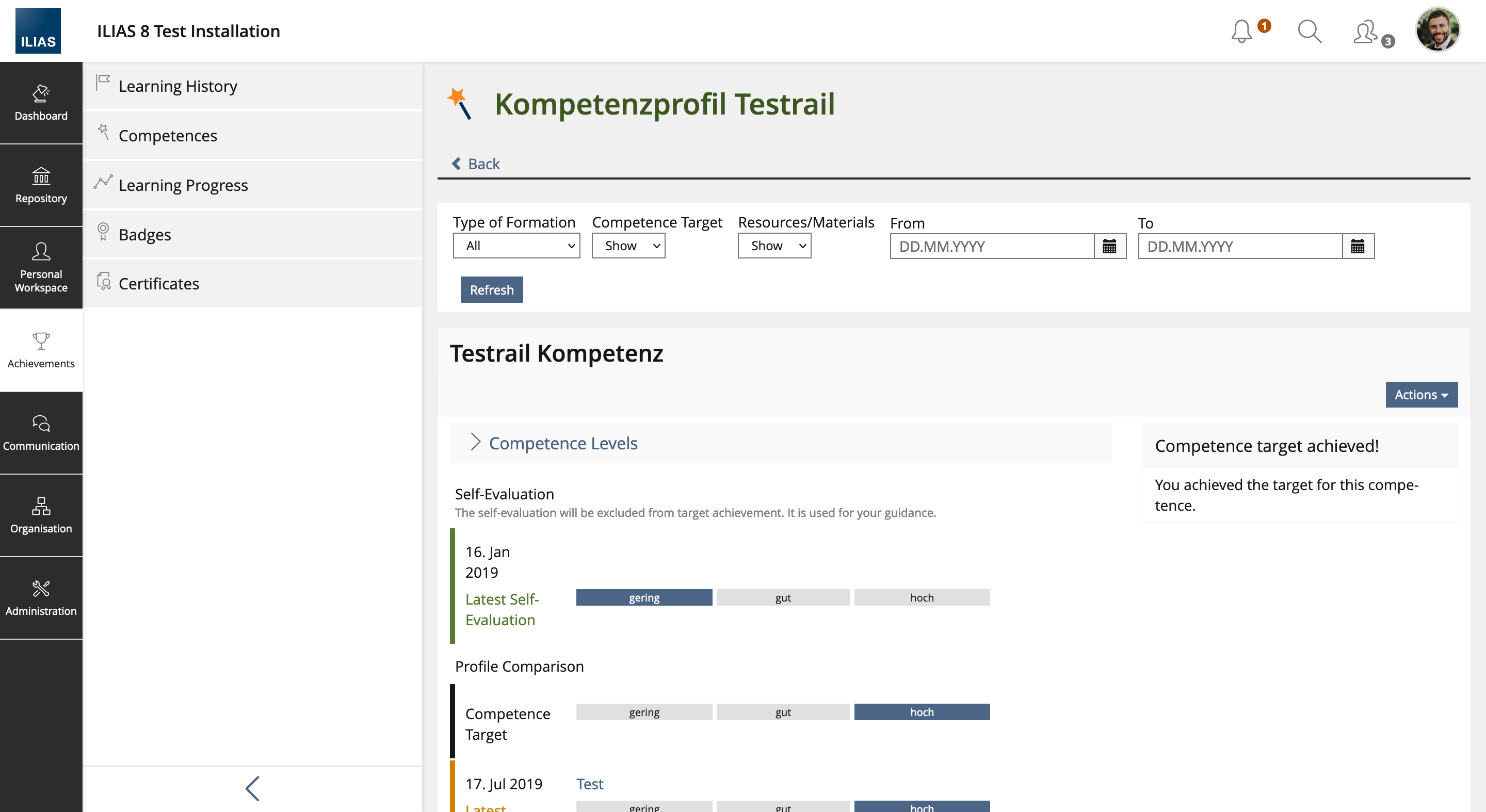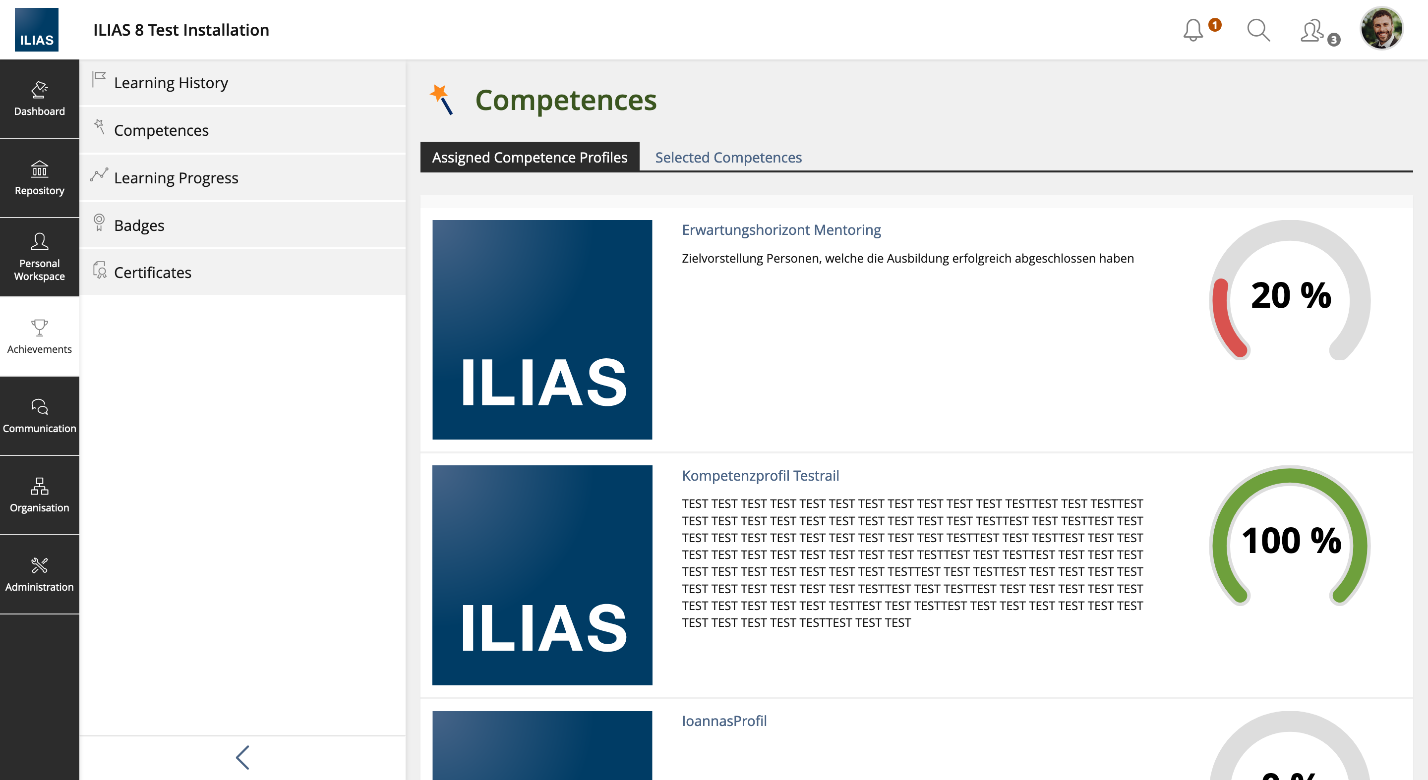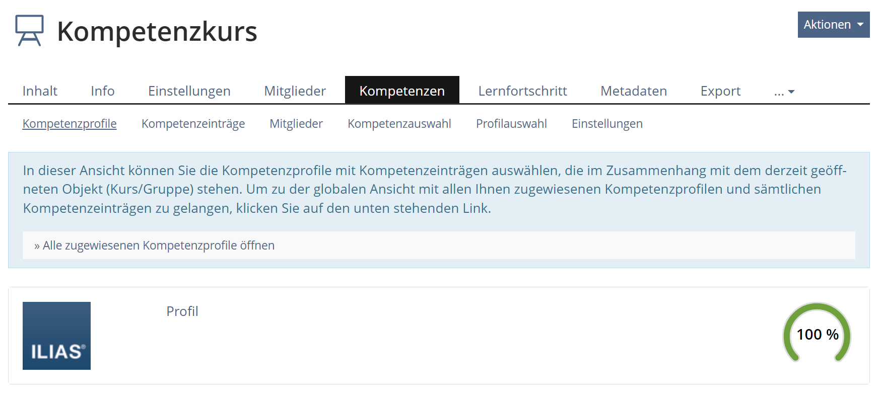 With ILIAS 8 the competence profiles in the overview under Achievement » Competences have been revised.