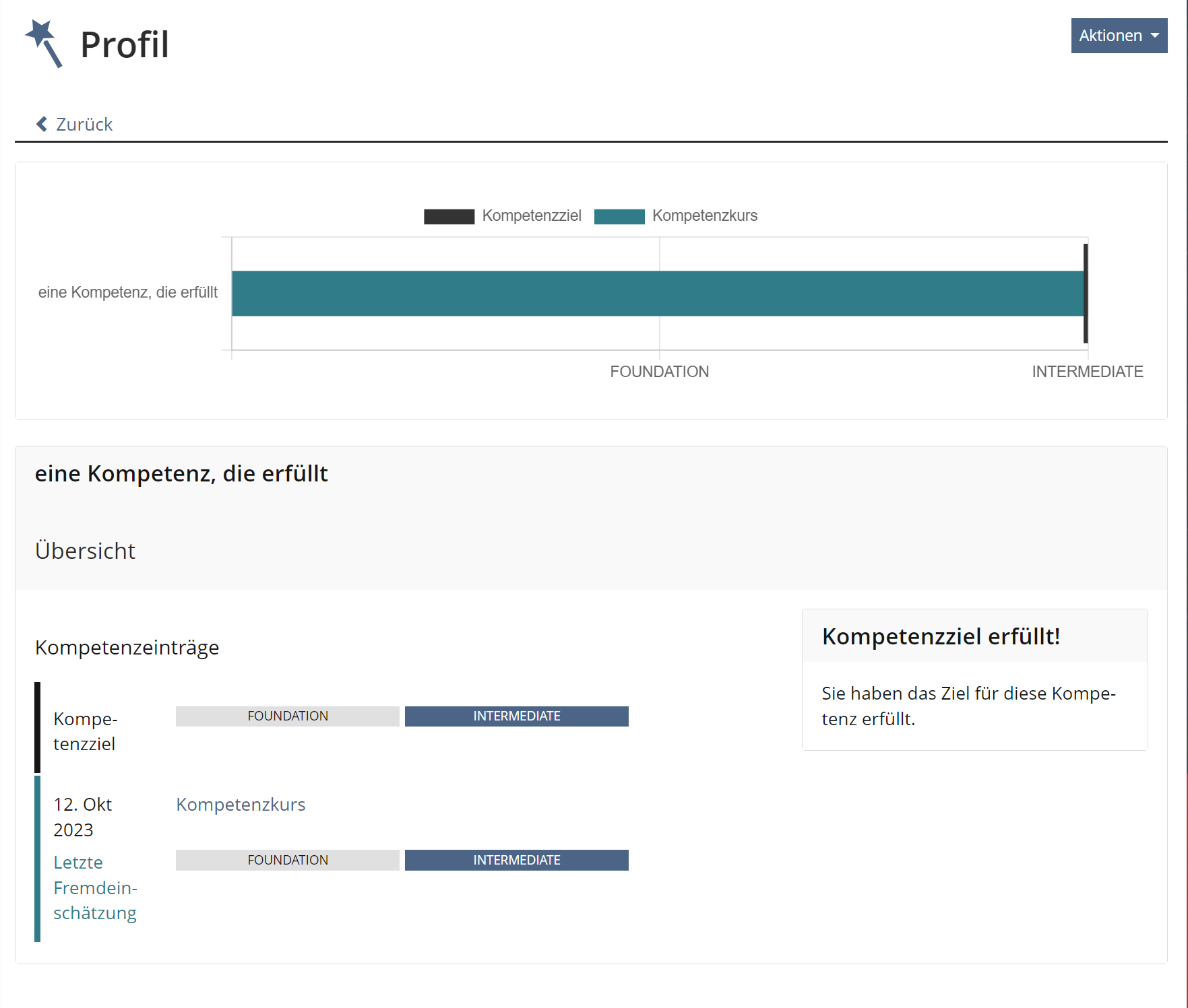 If a user clicks on a competence profile, the profile opens. The competence entries are displayed in a reporting panel. Via the "Back" tab, users can return to the overview "Competence Profiles" tab of the course or group.