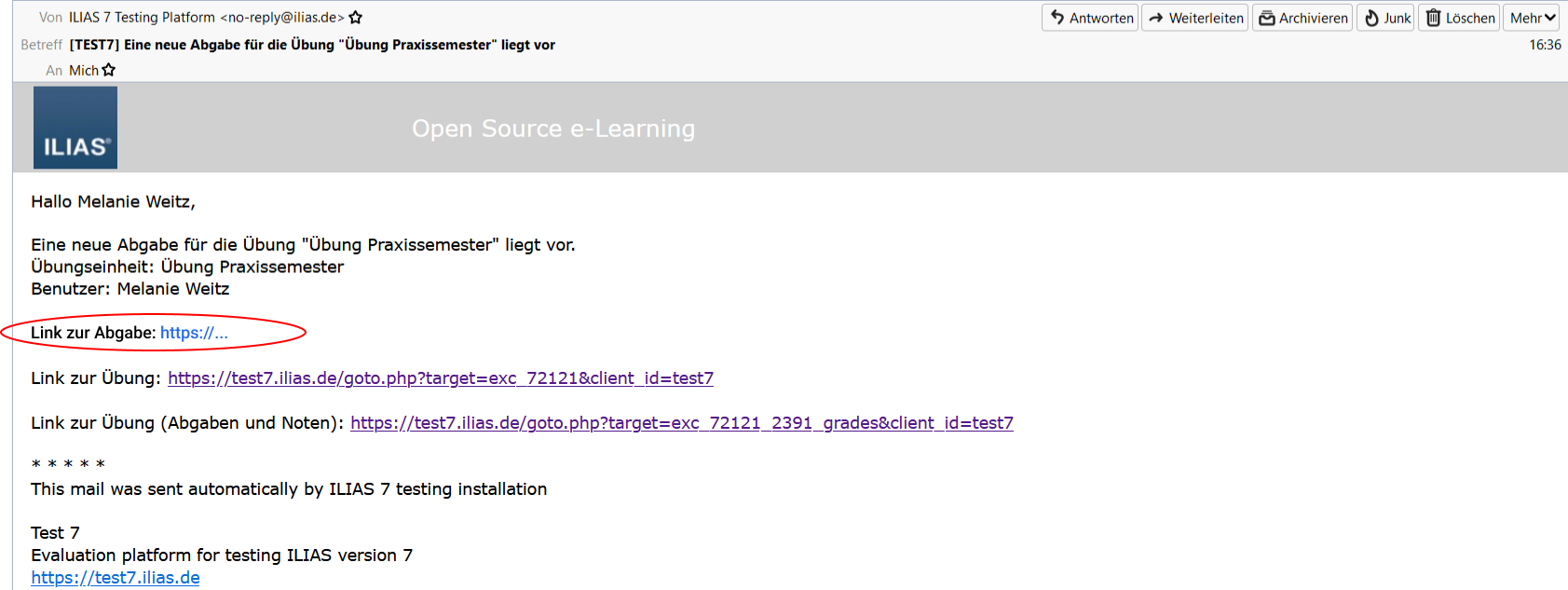 If students submit their portfolio in the context of an assignment, lecturers receive a notification mail that a new submission has taken place. However, the mail only contains: