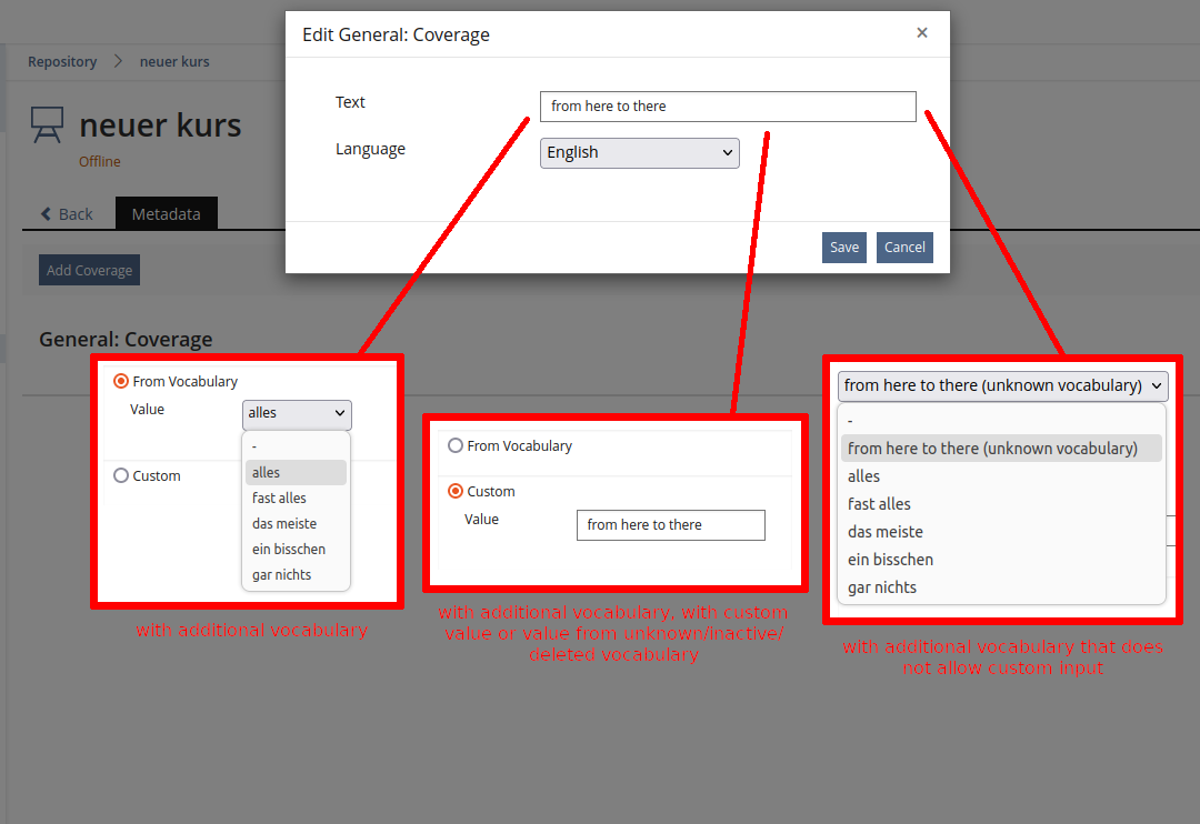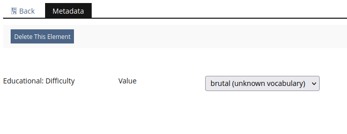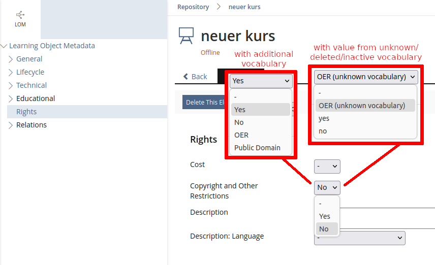 Controlled vocabularies can be deleted or deactivated. In both cases, their terms are not offered in the LOM editor anymore. Further, vocabularies for text LOM elements can disallow custom inputs when they are active. The following restrictions apply: