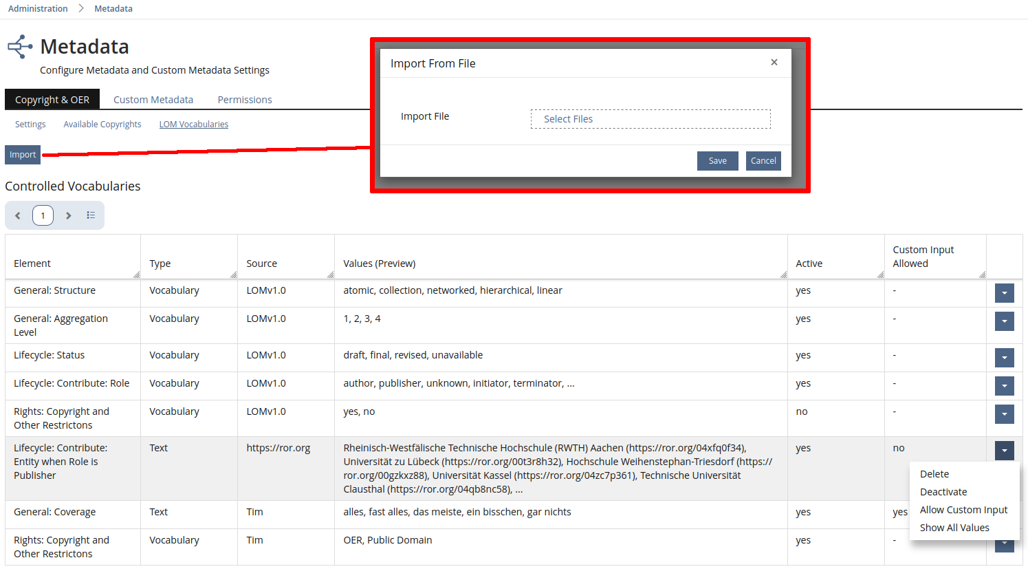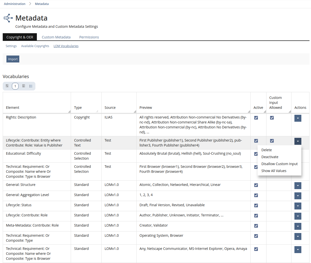 In the 'Copyright & OER' tab of the Metadata administration, in a new subtab 'LOM Vocabularies', all vocabularies are displayed. This includes both imported ones and those included in the LOM standard.