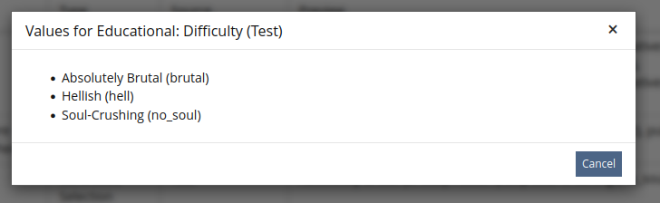 - Custom Input Allowed: If this vocabulary is active, is custom input allowed in addition to it? Only applicable to text LOM elements. The default is 'yes'.