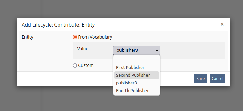 If an element carries a value from an unknown, deleted, or inactive vocabulary, that value is also offered with the token 'unknown vocabulary' appended in brackets (but not any other values from e.g. the same inactive vocabulary). - For elements that normally offer text input: Two radios 'From Vocabulary' and 'Custom' are offered. The latter offers a text input, the former a dropdown with the values of all active vocabularies.