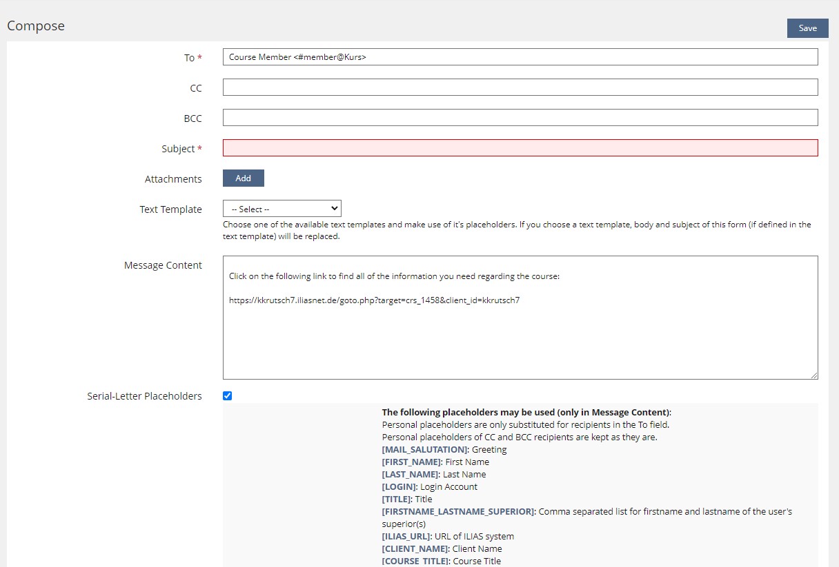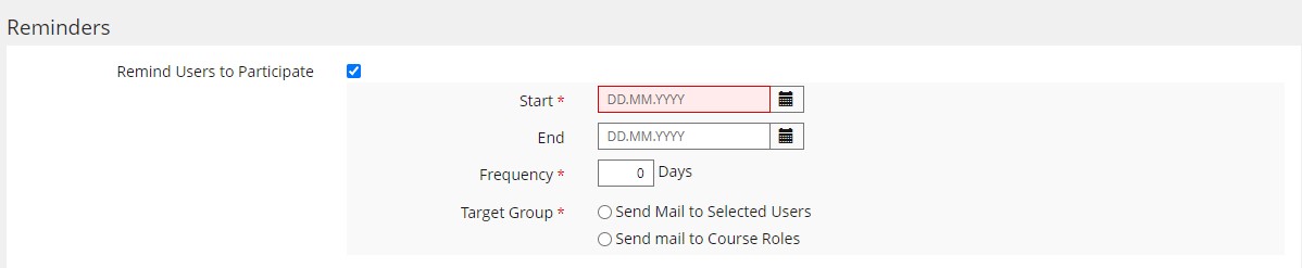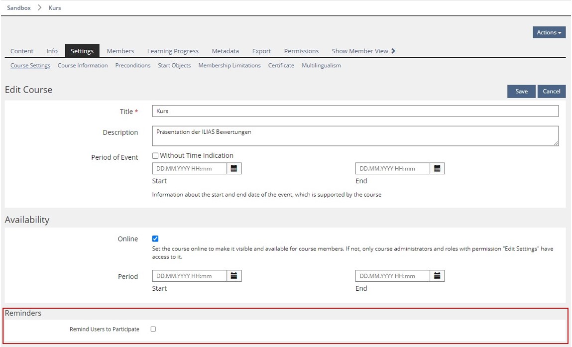 We suggest implementing this reminder feature in the subtab Course Settings of the Settings-area in the course object.