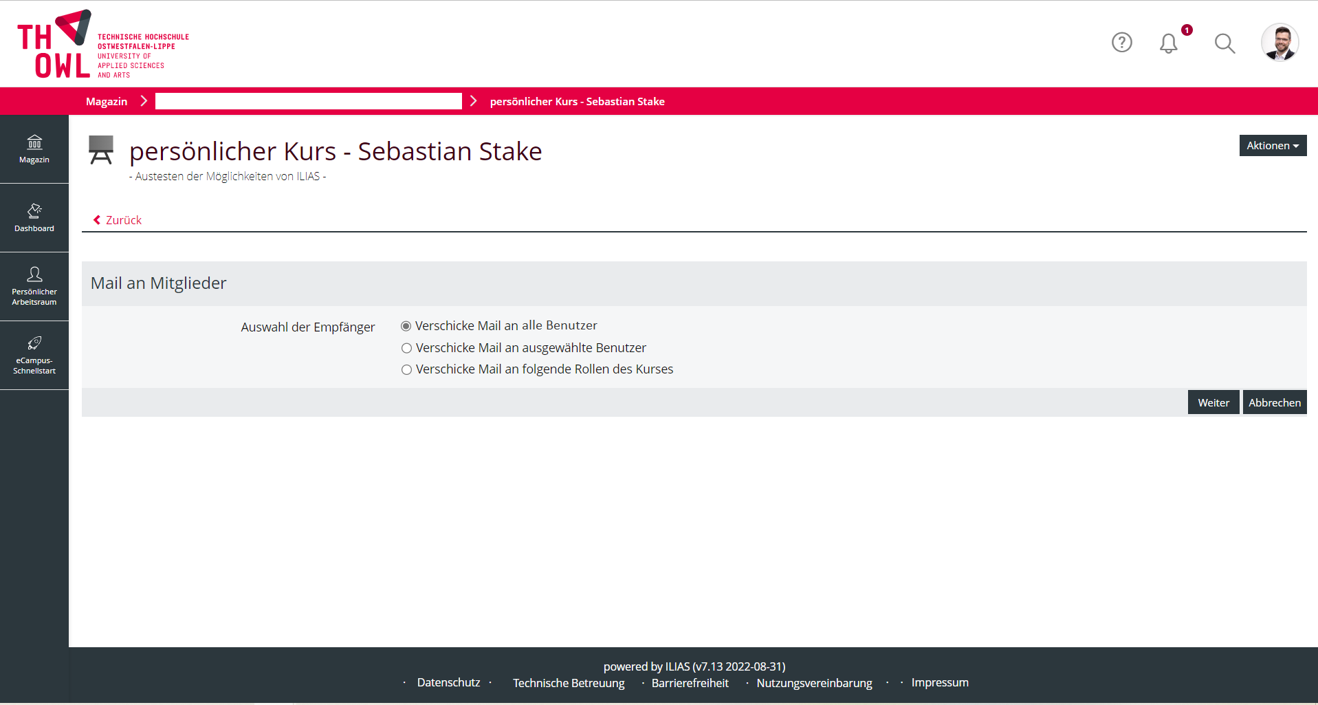 A lecteur selects Mail to members. After that he/she has a view to select the participant-circle. There a additional radio-button had to be implemented which selects all participants in the course. Because this is the common usecase it should be at the top an selected by default.