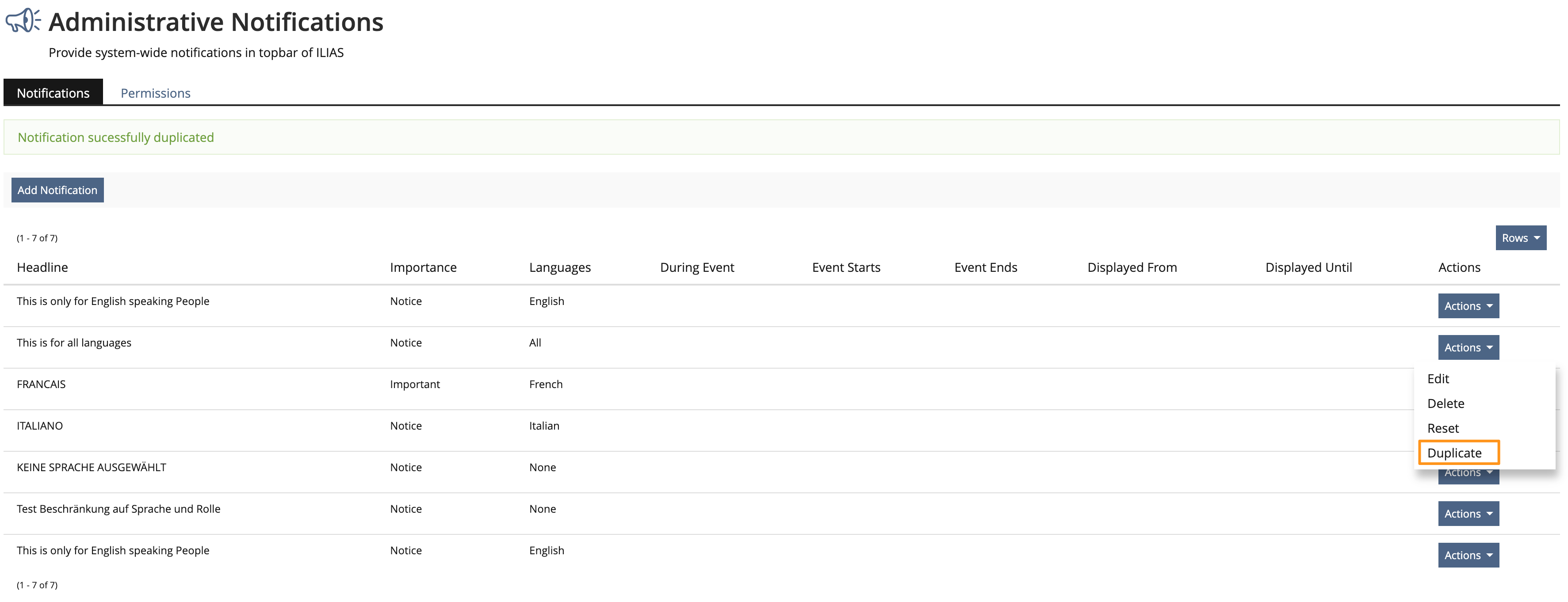 Notifications can be duplicated and the language(s) can be selected for each notification.