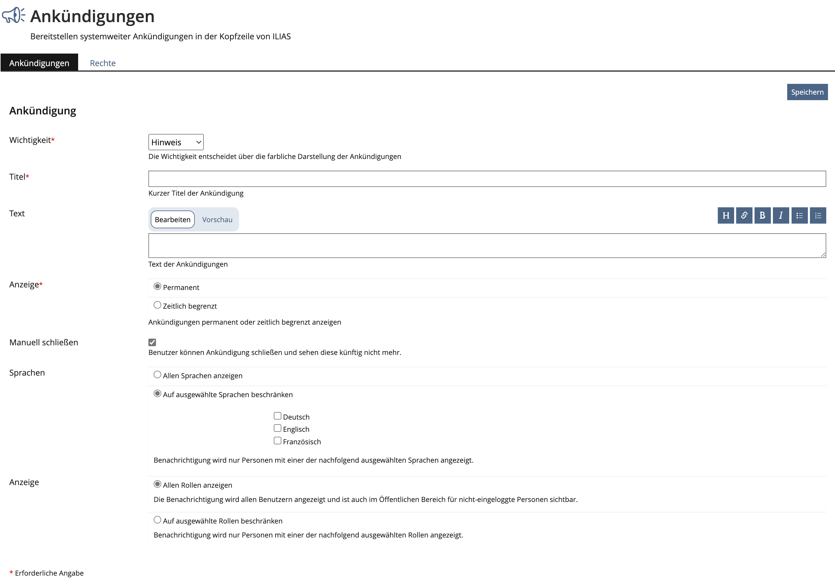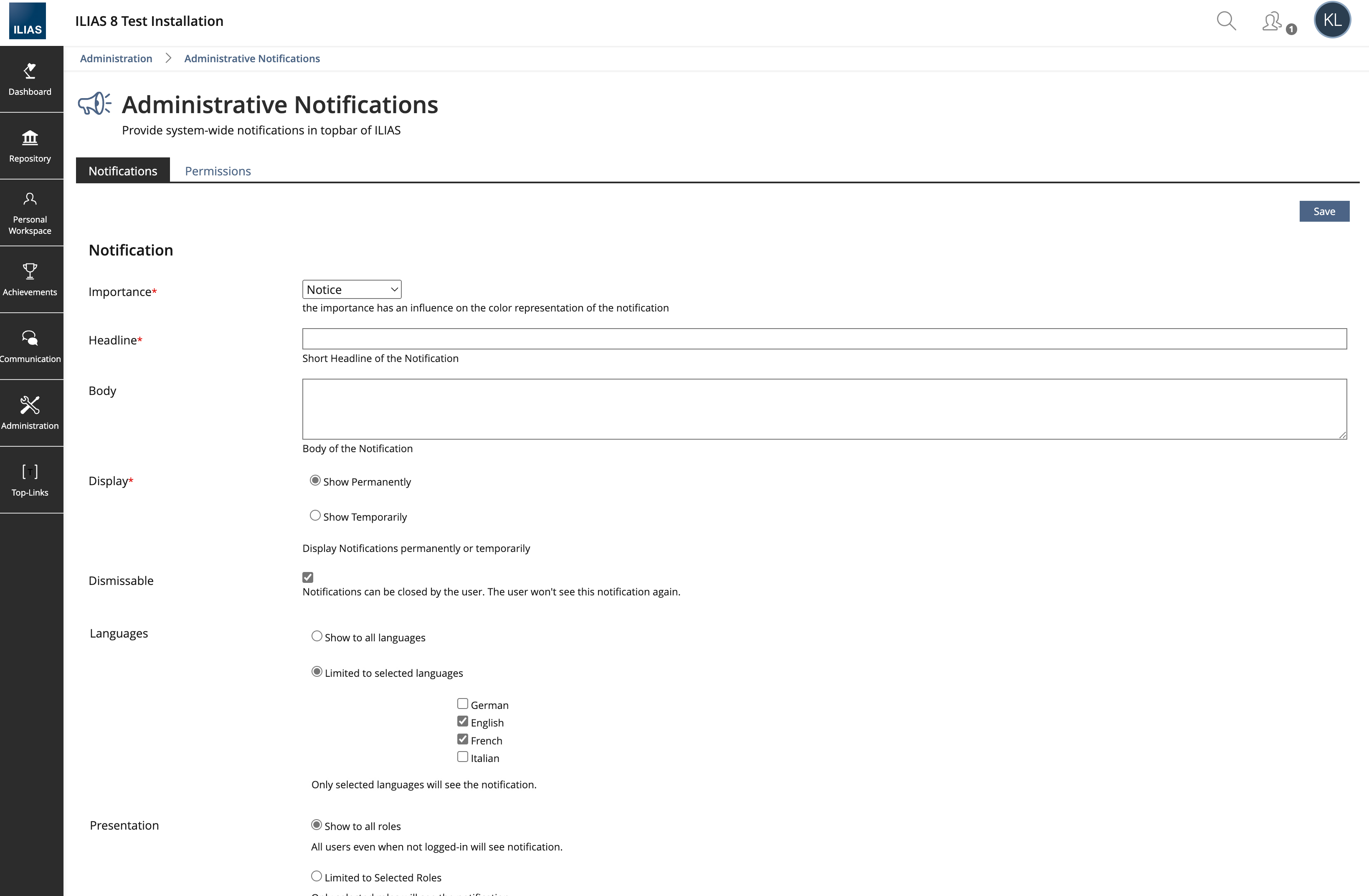 Administrative notifications can only be set up in one language. Sometimes it is necessary that administrators can inform their users in different languages, thats the reason why we want to improve the component.