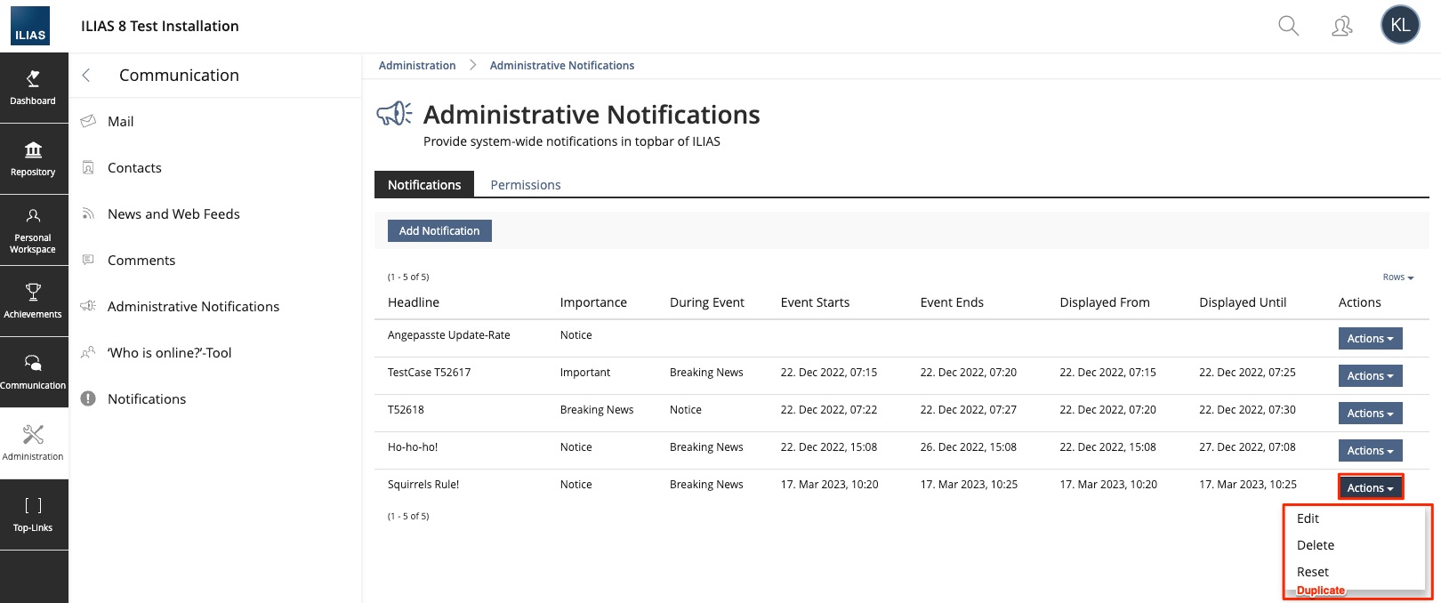 - Adminitration > Administrative Notifications