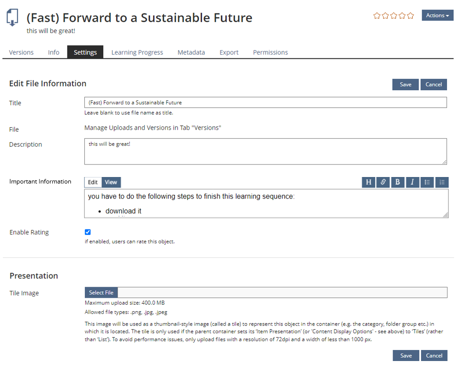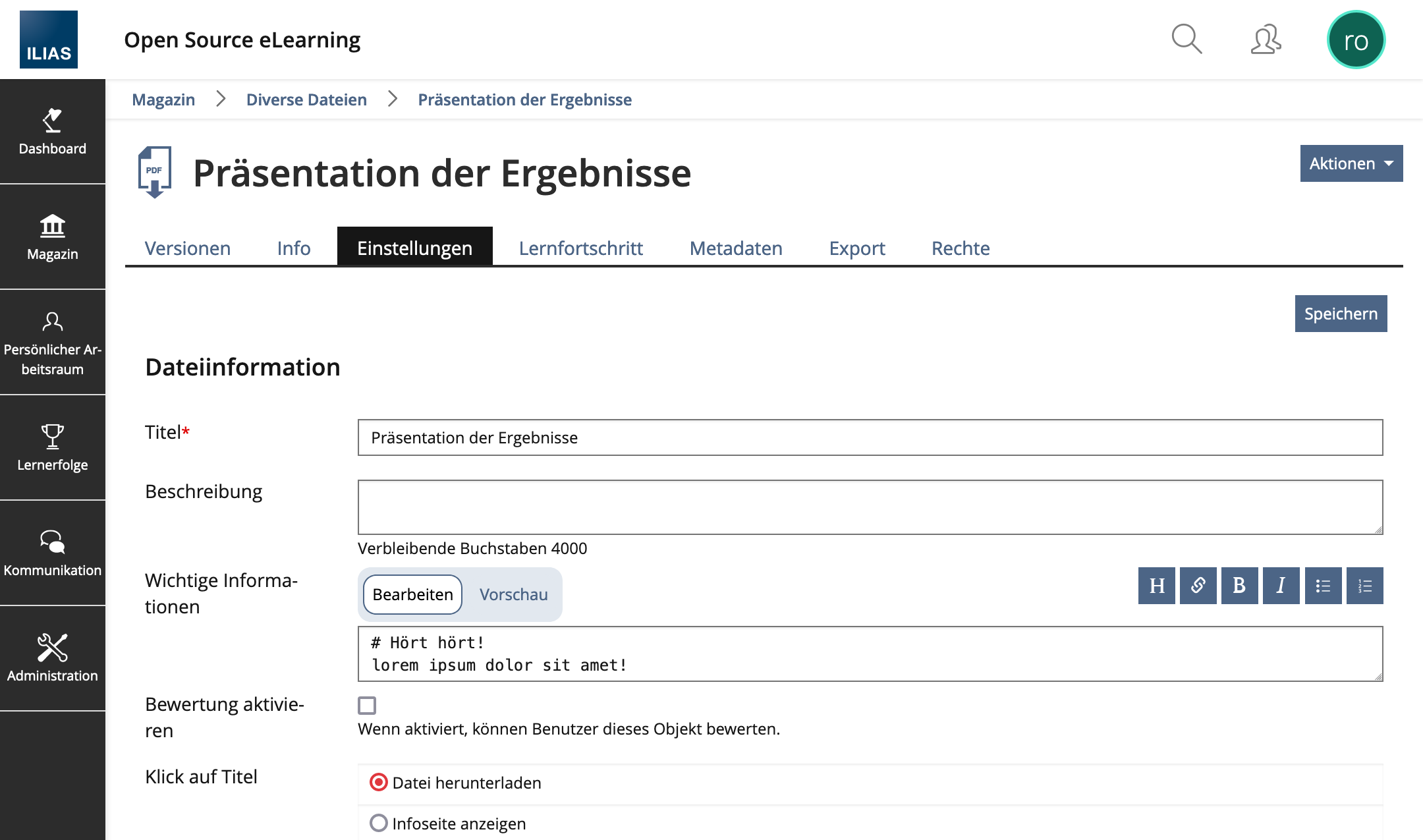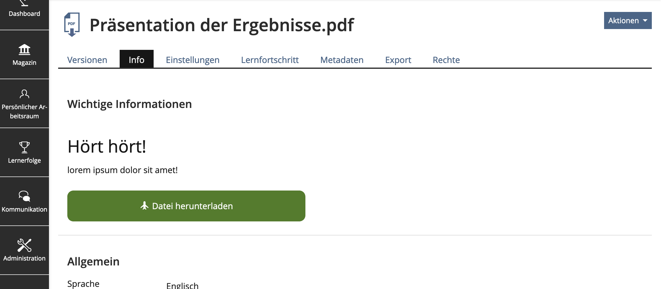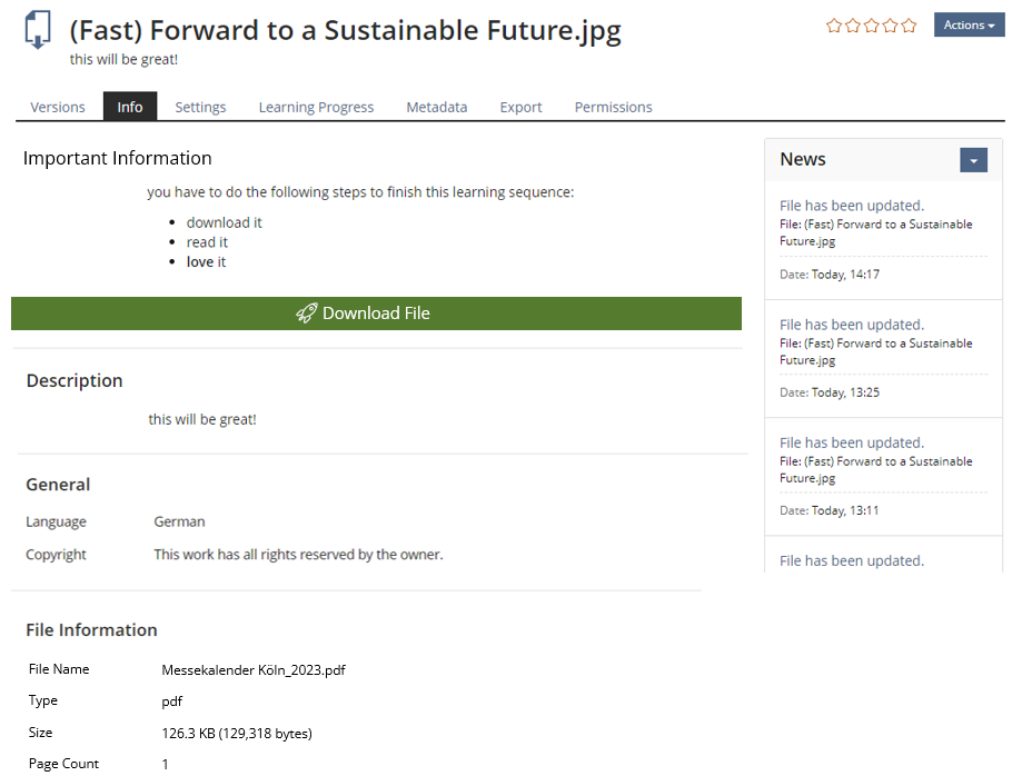 No work instruction can be added to a file. This would currently have to be stored outside the file object in ILIAS or - if the file type allows it - inside the file to be downloaded. In some cases, however, it may be useful if users can see the work instruction (or other important information) and download the file directly on the same page (Info Page).
