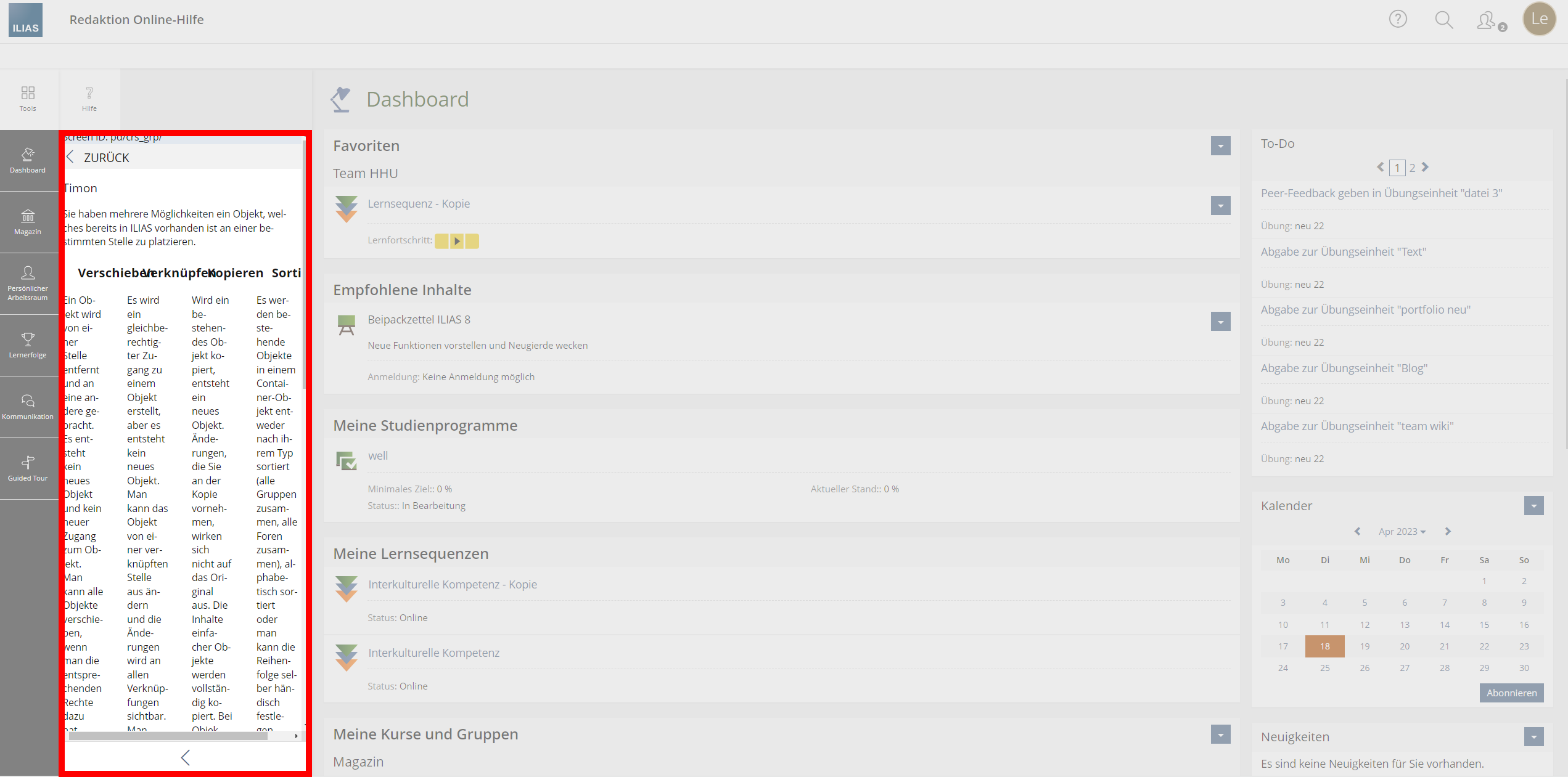- Column layout in help slate: JF Decision, 15.05.2023 - We see the need to use the Online Help learning module for the online help and for documentation purposes. But we prefer a clear solution for the problem of displaying an ILIAS learning module in the slate. The current suggestion is too much "hacky" for us. A concept workshop for a feasable solution would be highly appreciated.