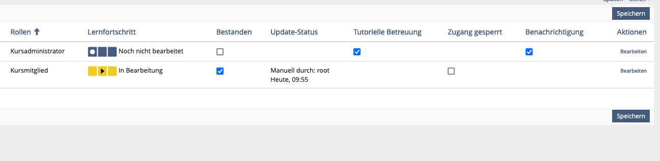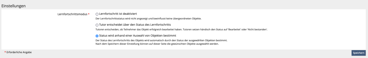 If the learning progress mode is set in such a way that only the tutor can set the status, no status is adopted from the object. If the tutor wants to change the status, the learning progress mode must be changed first. When the tutor has finished editing the learning progress manually, he must not forget to change the learning progress mode to "Status is set based on objects...". Otherwise it can happen that course participants complete the course but the status is not set.