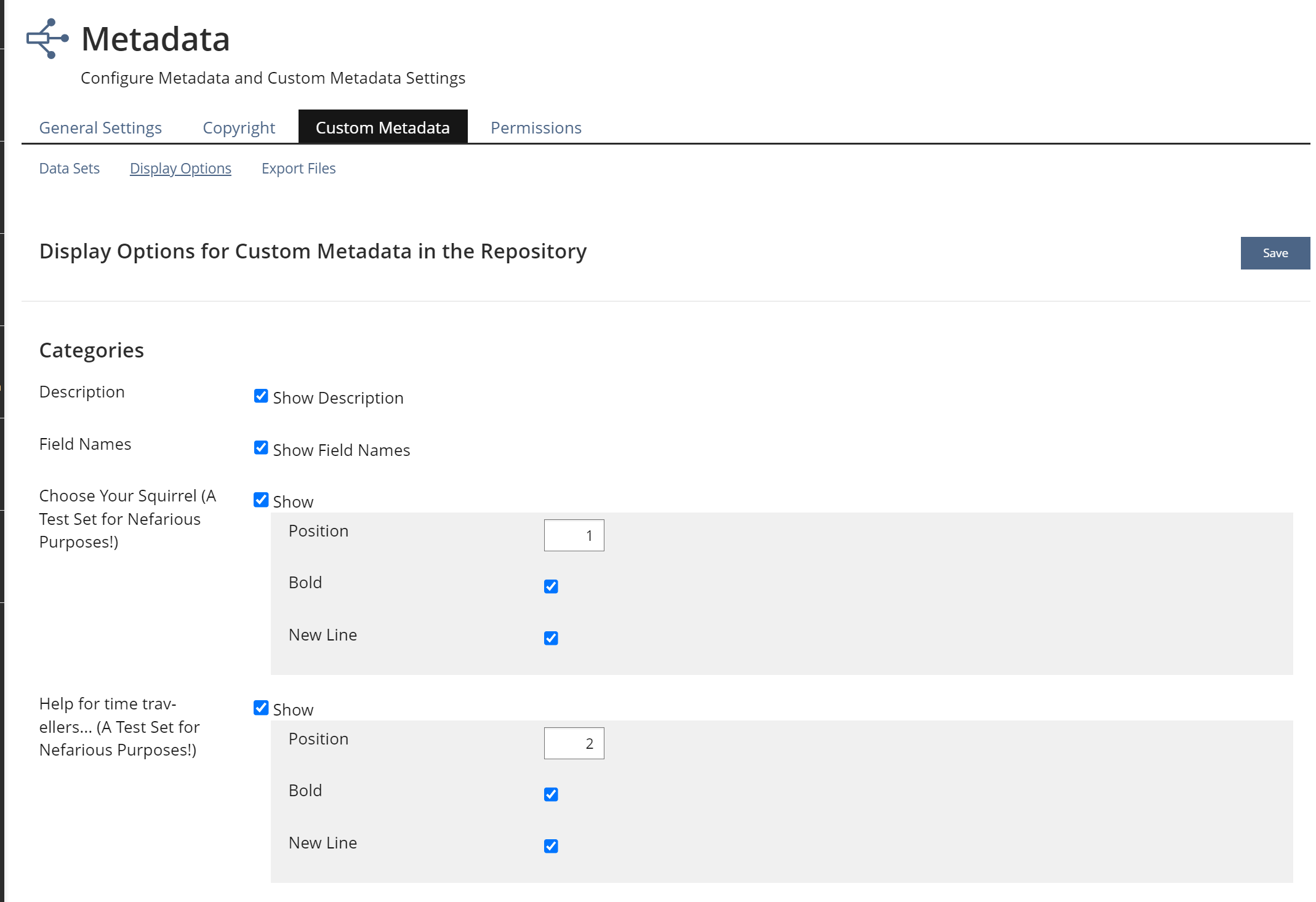 The views "Display Options for Custom Metadata in the Repository" currently uses a legacy UI forms, and is due to its length a bit cumbersome to work with.
