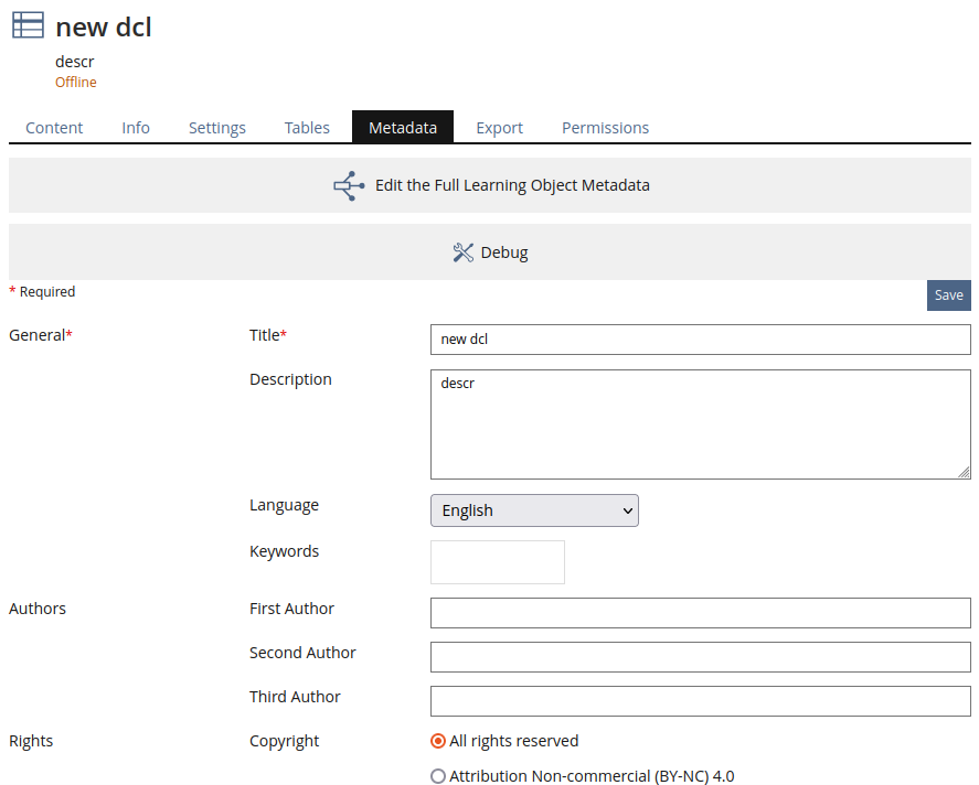 Data Collections will have a tab 'Metadata' with subtab 'LOM', which will always be shown. Like for all other LOM-enabled objects, the subtab 'LOM' contains the quick edit form for the object's LOM, as well as a button leading to the full LOM editor (see Moving LOM Metadata Editor to Kitchensink for details).