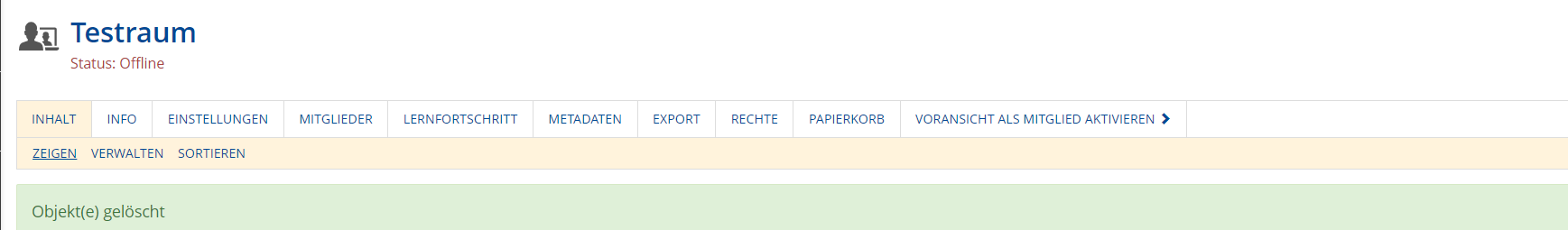 - A user with "Delete" permission for an object comprised in the course, group or folder has actually deleted an object from a course, group or folder, they are presented with an additional tab "Trash".