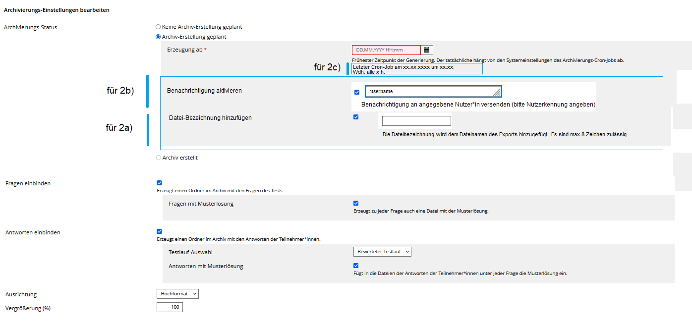 When creating an archive export, the export, which is often executed via a cron job at odd times, appears in the Export tab of a test. The name of this export file is typically cryptic and unique, much like many other ILIAS export files. This poses a problem for individuals responsible for performing multiple archive exports and storing them in another system. They have to locate these files in different places and they are not easily distinguishable. Additionally, since the exports are executed at unknown times, the individual triggering the exports does not know when they will be available for retrieval.