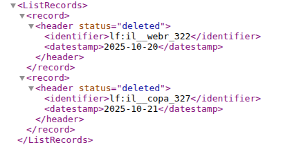 To this end, ILIAS will keep track of previously published deleted objects (or otherwise 'unpublished' objects, e.g. via a change in copyright information) for 30 days after their deletion. During these 30 days, this deletion will be exposed via the OAI-PMH interface, and querying repositories can react accordingly.