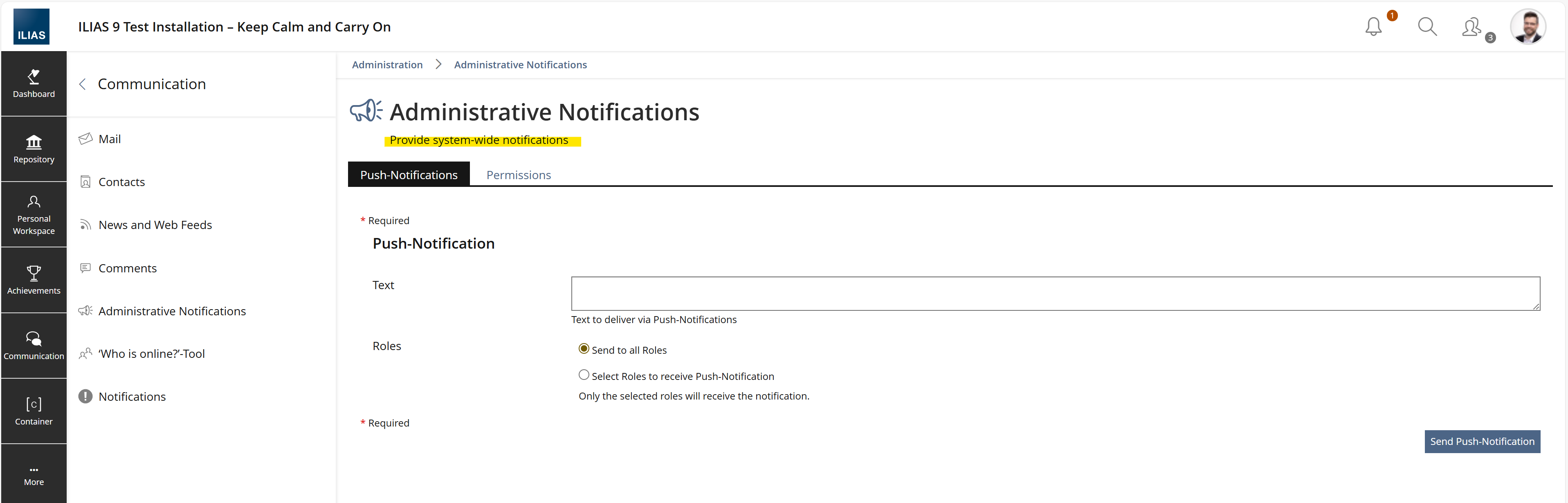 If an administrative Push-Notification is send, all Users (when have activated the Push-Notifications in personell settings and Browser/OS) will receive this message. This option is intended to complement the existing administrative notification options, not replace or duplicate them. Therefore, push notifications should not be sent automatically when the existing administrative notification options are used.