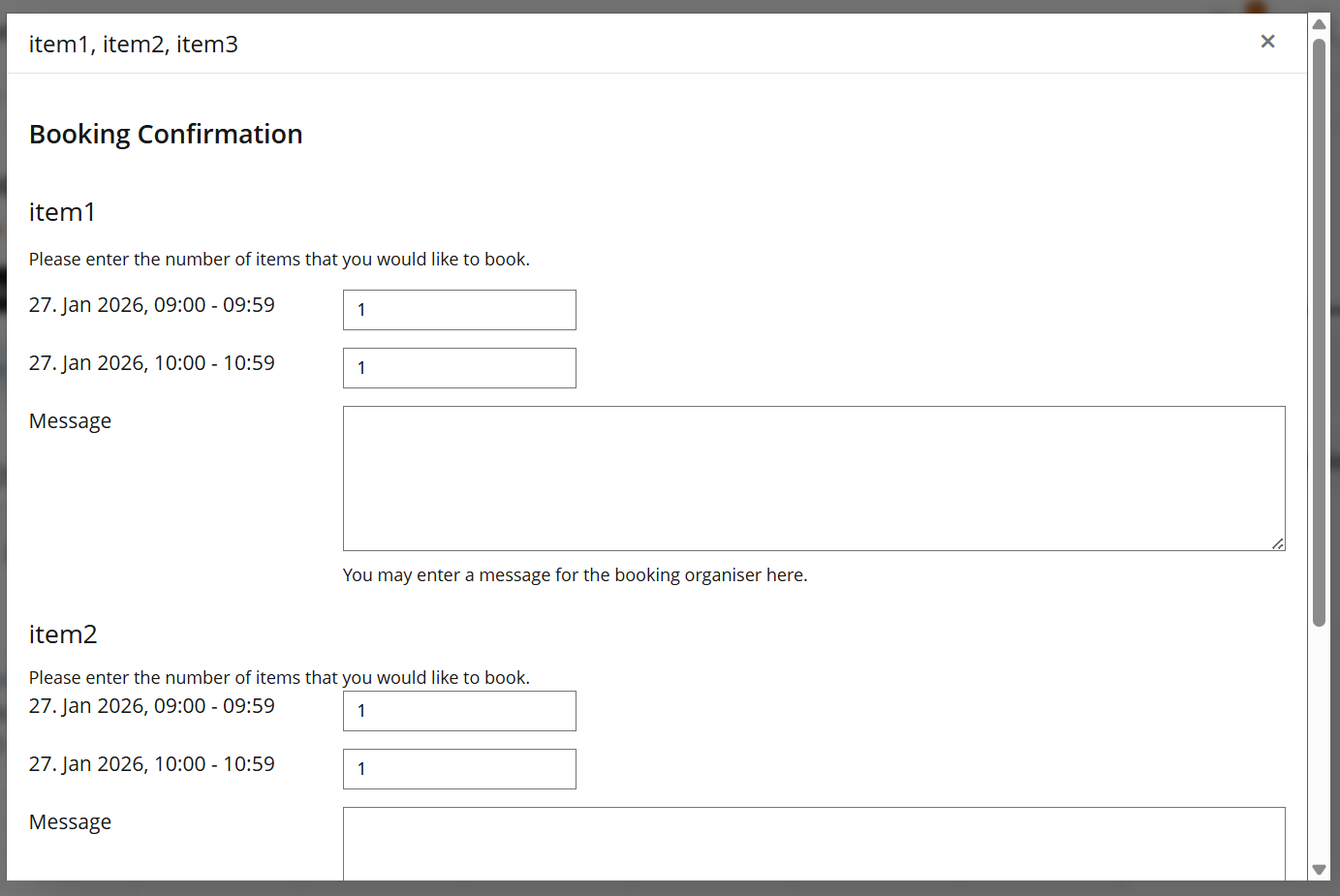 - The modal for completing the booking with the possibilty to enter a message is shown. One message for every picked Bookable Item can be entered.