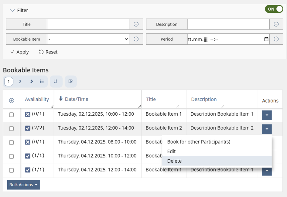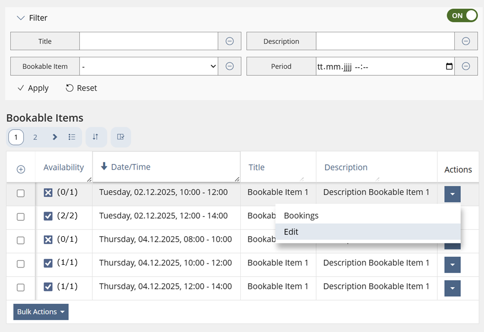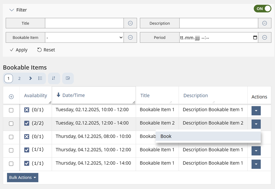 - Checking the checkbox of multiple Bookable Items / Time Slots (rows) and use the Bulk Actions underneath the table.
