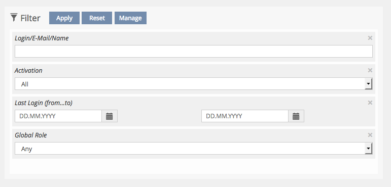 By clicking on the filter item the user opens a popover that contains the input elements to change the filter values. One filter item can contain a single field as well as a group of fields. This is usefull to group fields that are most often used together (like some filter item for a time period) or that are often used optionally (like login, firstname, lastname), where most of the time only one of the fields will be used. Note that even the filter items that do not show inputs to change the items indeed give an indication of the values that are currently set. Grouping fields and moving the inputs in a popover is a major space-saving compared to the current filter implementation.