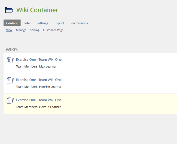 - When any team member creates a new wiki for an assignment the owner of the newly created wiki will be the owner of the exercise. Also before creating the wiki the permission of the owner of the exercise to create new wikis in the target location is checked. The team members will not need the creation permission and will not become owner of the wikis.
