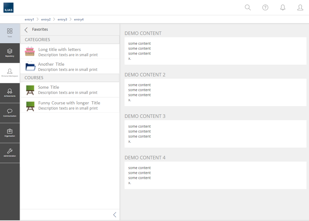 Kunkel, Matthias [mkunkel], 08 APR 2019: The English language file of ILIAS is using British English. Therefore, the new slate should be called "Favourites" and adding repository objects to this list should be labeled "Make Favourite". I also have corrected this in the title of this page.