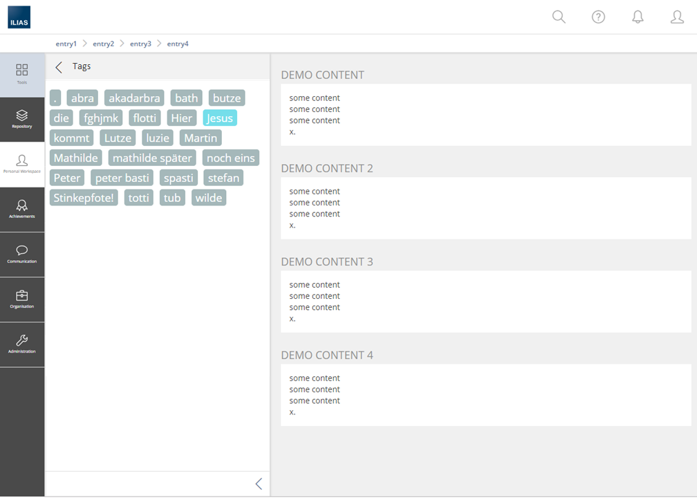 JourFixe, ILIAS [jourfixe], 11 MAR 2019 : We highly appreciate this suggestion and schedule it for 6.0. At the time being we cannot say how the slates look like and behave. So it might be that there are still changes in the presentation of Favourites or Bookmarks once the slades are available. But for now, the heritage presentation of Bookmarks and Tags can be re-used. Nevertheless, renaming and replacing can be done anyway.