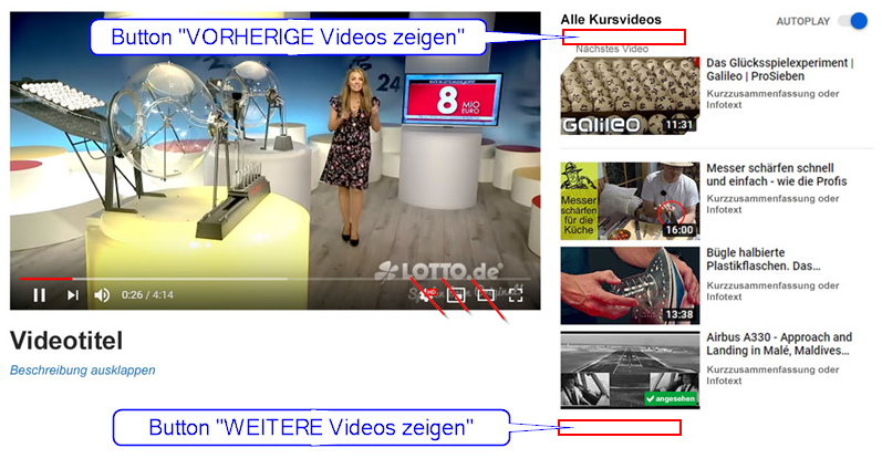- With a button "Show previous videos", previous videos can be shown step by step at the top of the list. The button is inactive or hidden if there are no previous videos.