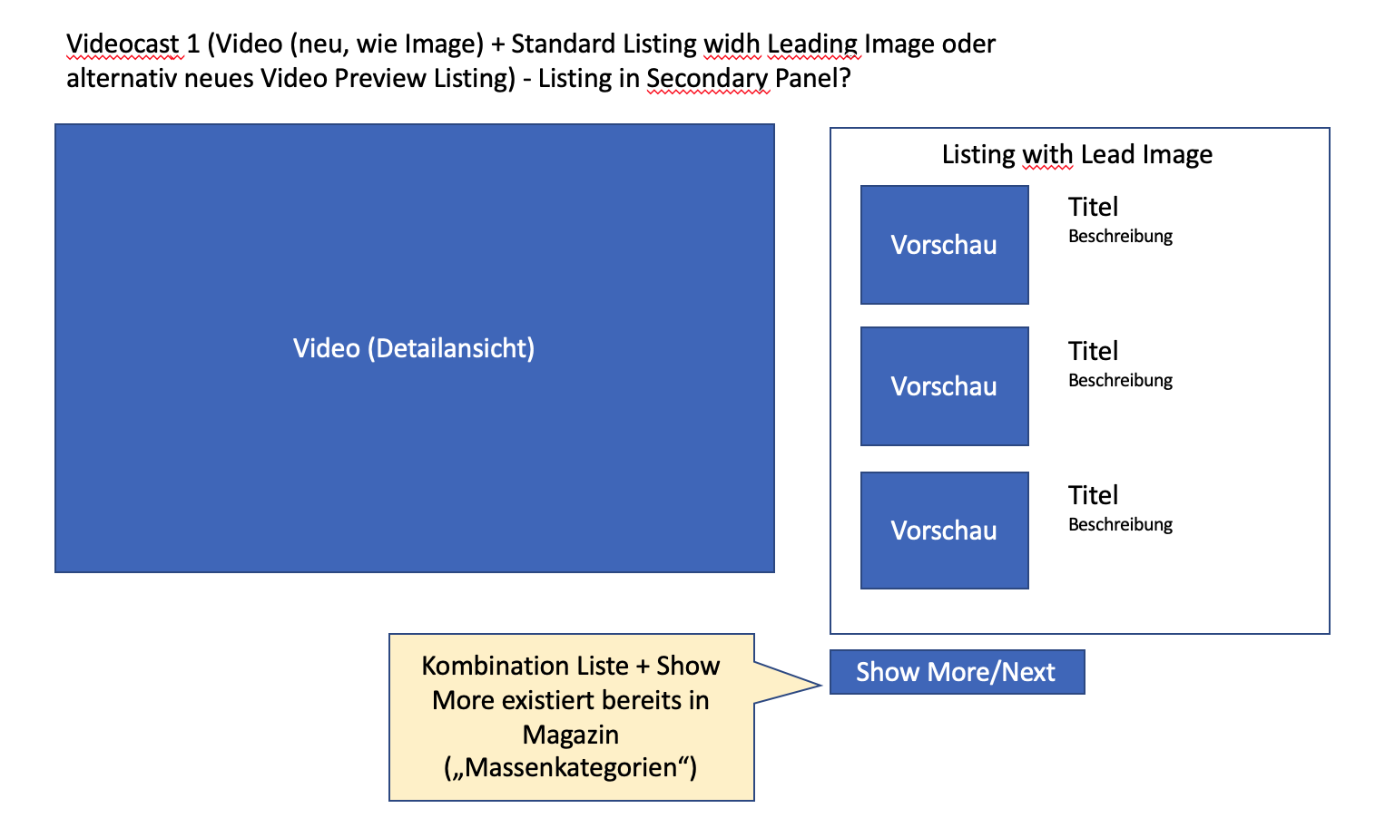- The use of known patterns is very important and valuable for the UI. At the same time, it is important to keep in mind that following well-known big players also arouses certain desires and requirements. Why, for example, do you have to show videos with a button "Weitere Videos anzeigen" on the right and can't simply scroll through the list? (Jakob's Law)