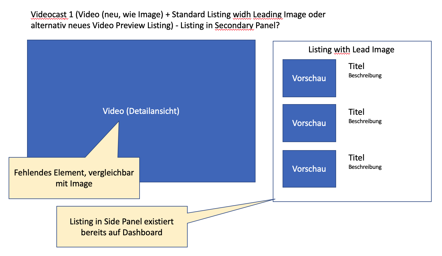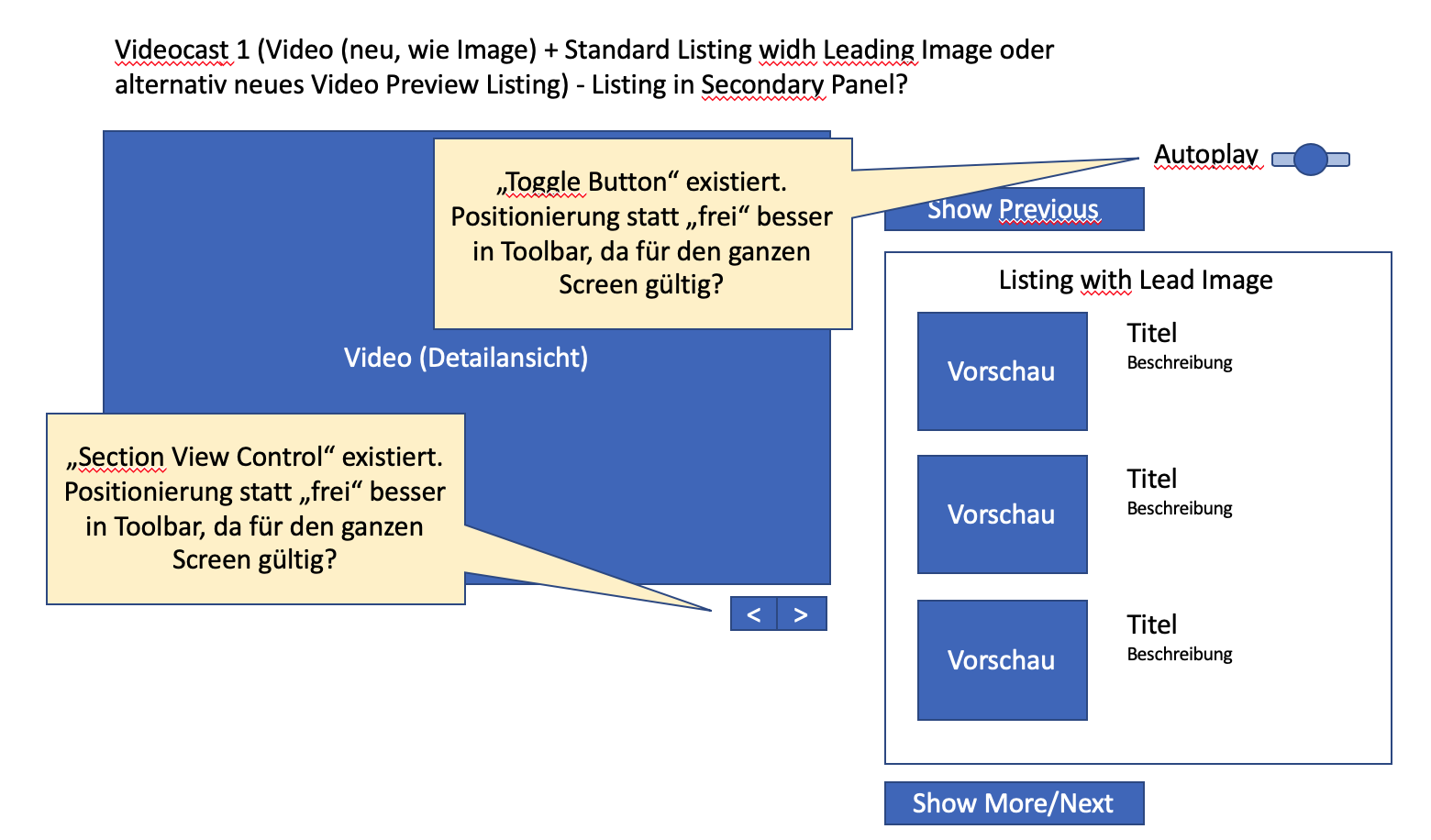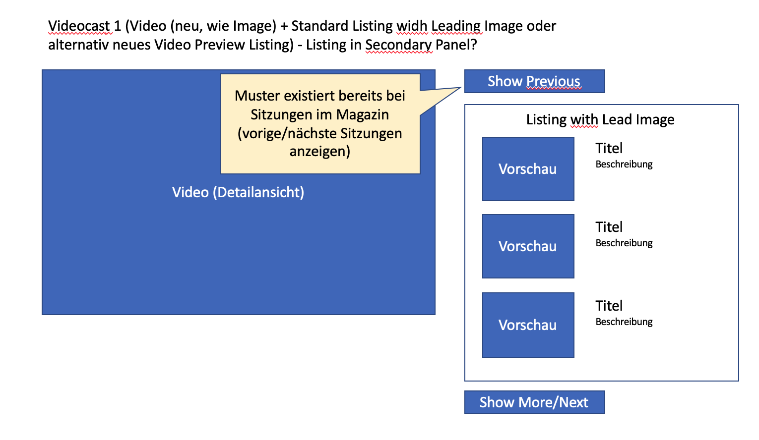 - What I am missing as an important usecase is a start screen, where a user sees all videos at once when he opens the mediacast. Other video portals also have an overview of several videos in a first step, before going into a detail mode where a video is in focus (we ask ourselves: which one is the first or the last or a selected one?). We also assume with a video podcast that a user needs a certain overview of all videos (e.g. lecture recordings) in order to select a specific one. In the proposed solution only a limited selection is visible and I have no chance to get a quick overview of all offers.