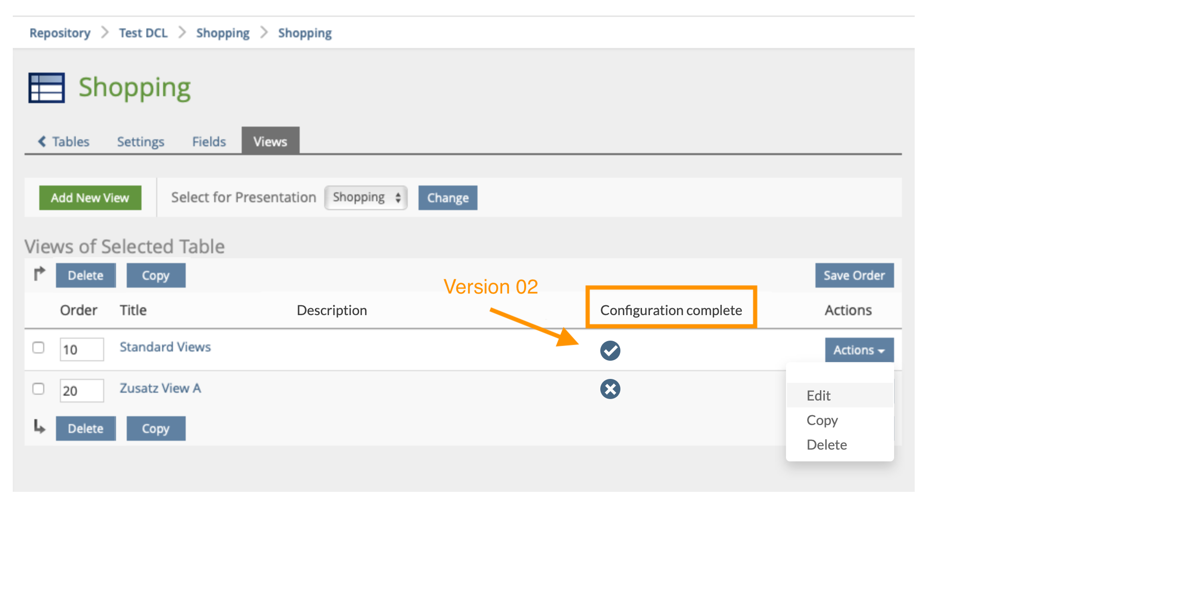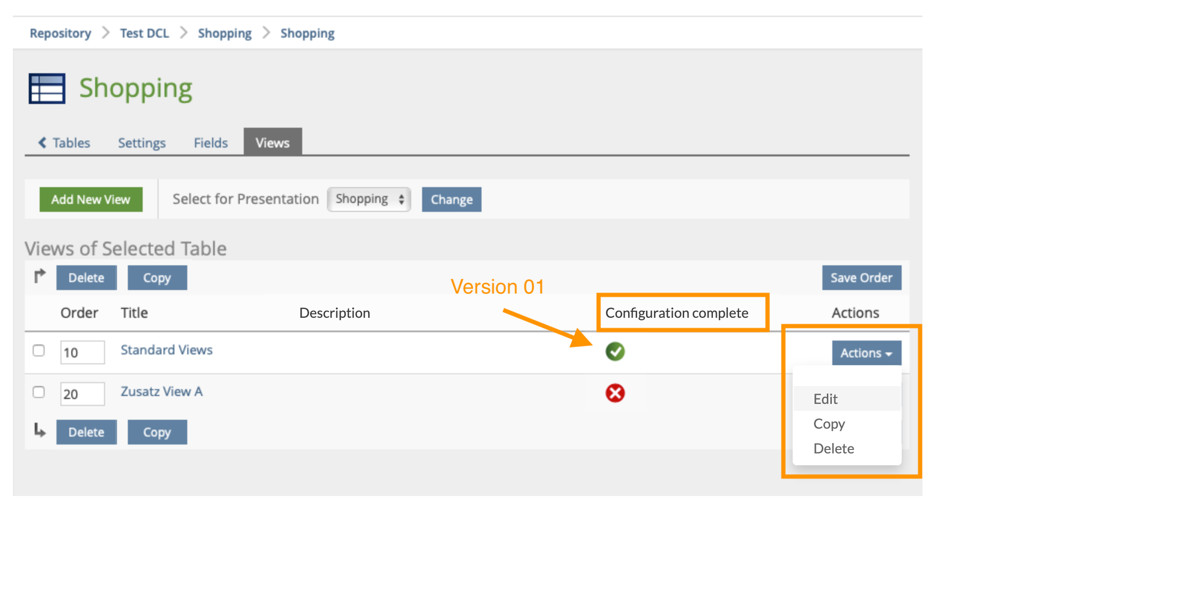 - Button “Actions” with a reduced menu (“Edit”, “Copy”, “Delete”)