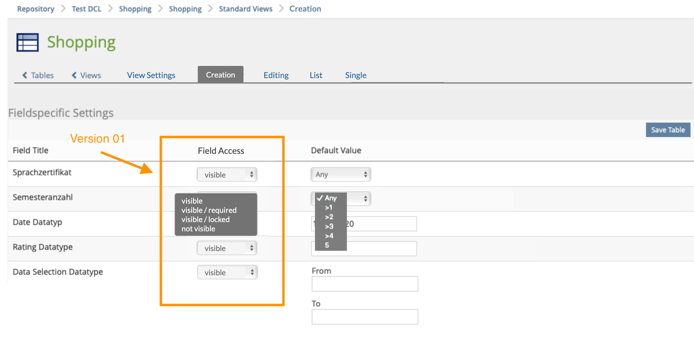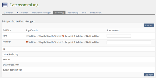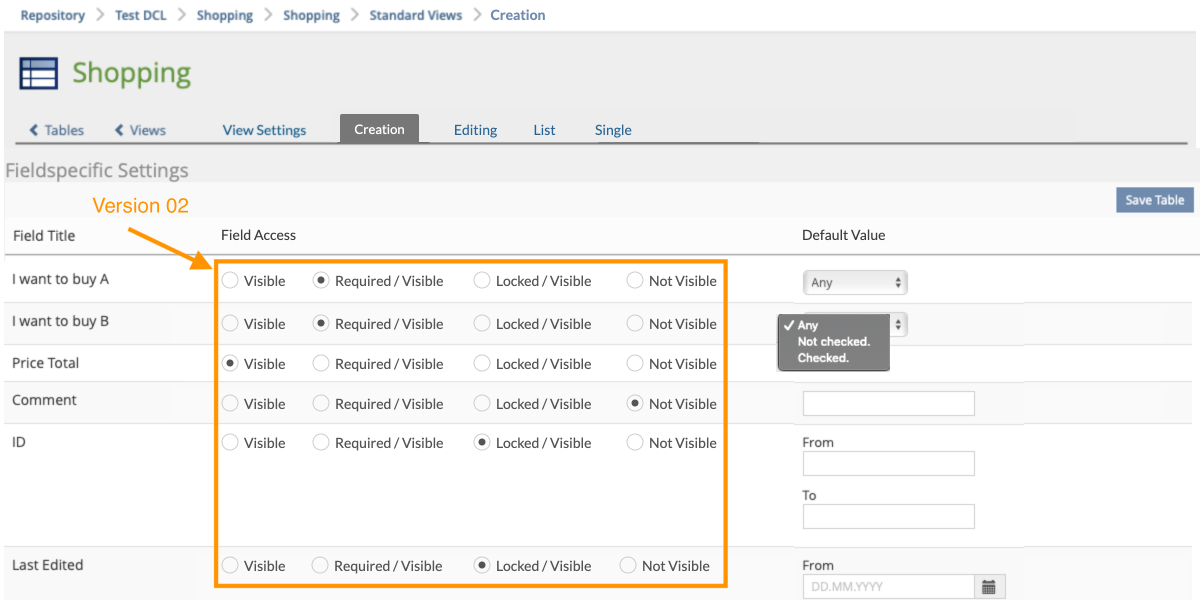 - Radiobuttons “Field Access” (visible, visible / required, visible / locked, not visible) or drop-down (s. mockup "Creation")