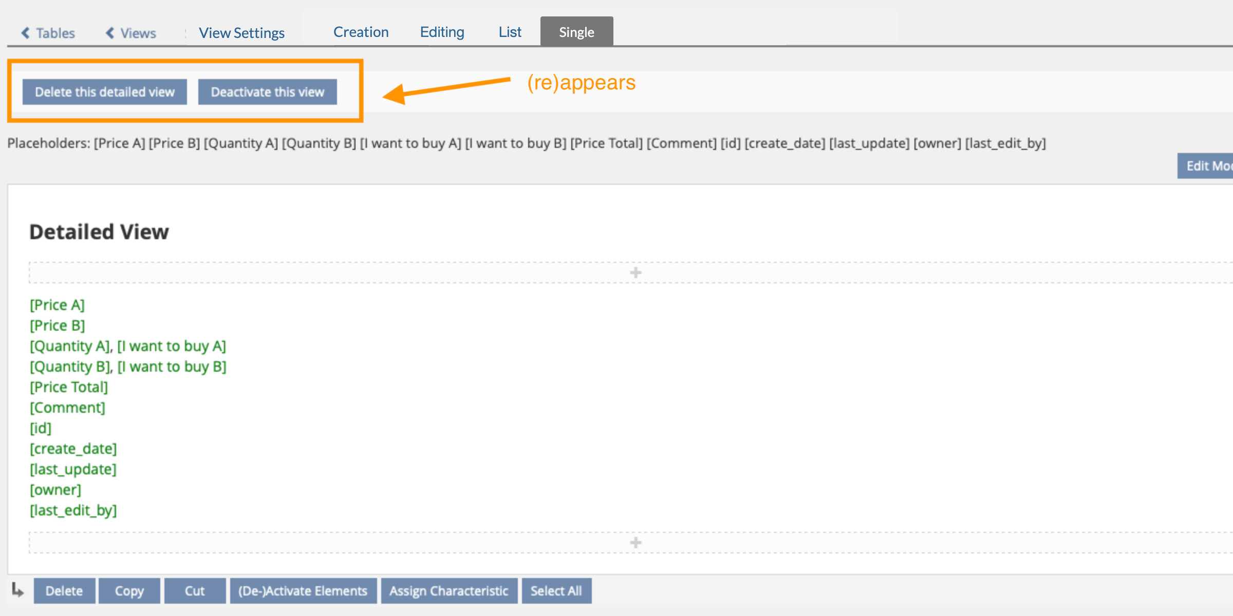 - For a better usability: The buttons to activate/deactivate/delete the list view are hidden in edit mode (1) and (re)appear after saving/editing (2).