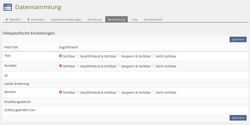- Column 'Field access' in new create view and Edit view could use radio buttons (even if this might result in trouble on mobile screens). But labeling should be "Visible & Required" instead of Visible / Required" a.s.o.