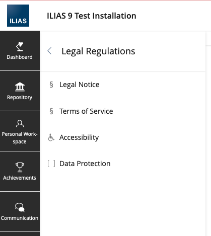 There are various legally relevant texts that need to be managed in an ILIAS installation. These include 'Legal Notice', 'Terms of Service', 'Accessibility Info' and the still to be implemented 'Declaration of Data Protection'.